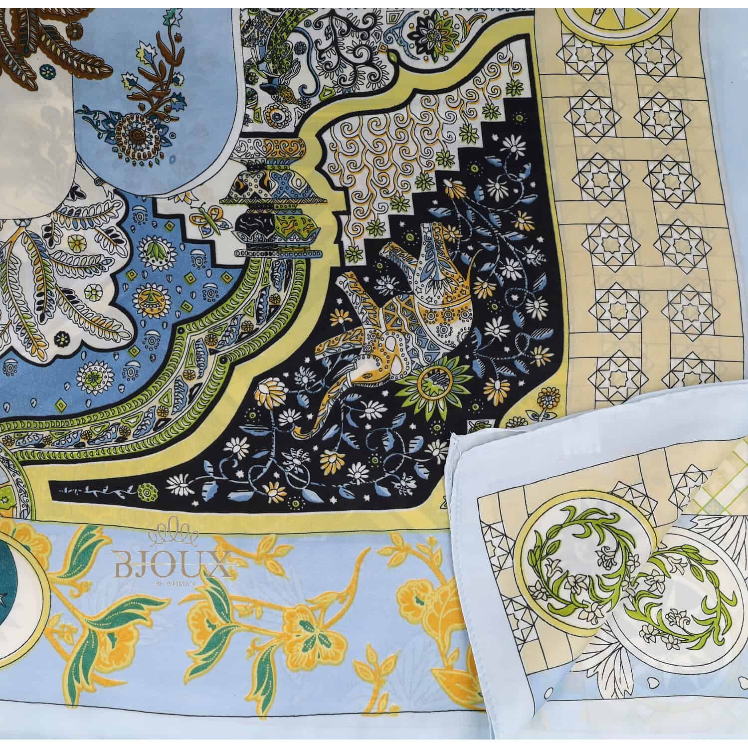 Foulard da donna in viscosa 70×70 doppio uso, collo / borsa . Composizione 70% silk 30% visc. Stampa fantasia