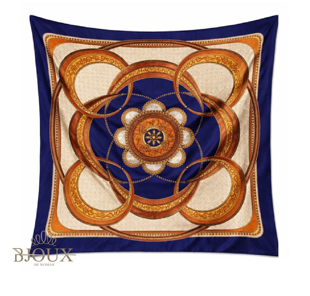 Foulard raffinato con base blu profondo e decorazioni barocche nei toni oro e arancio. Elegante, deciso e altamente distintivo.