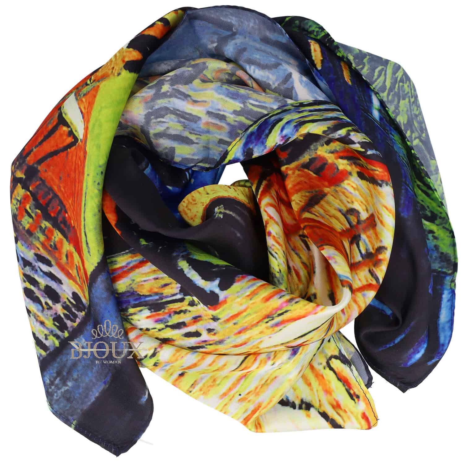 Foulard da donna in seta 70×70 doppio uso, collo / borsa . Composizione 70% silk 30% visc. Stampa fantasia