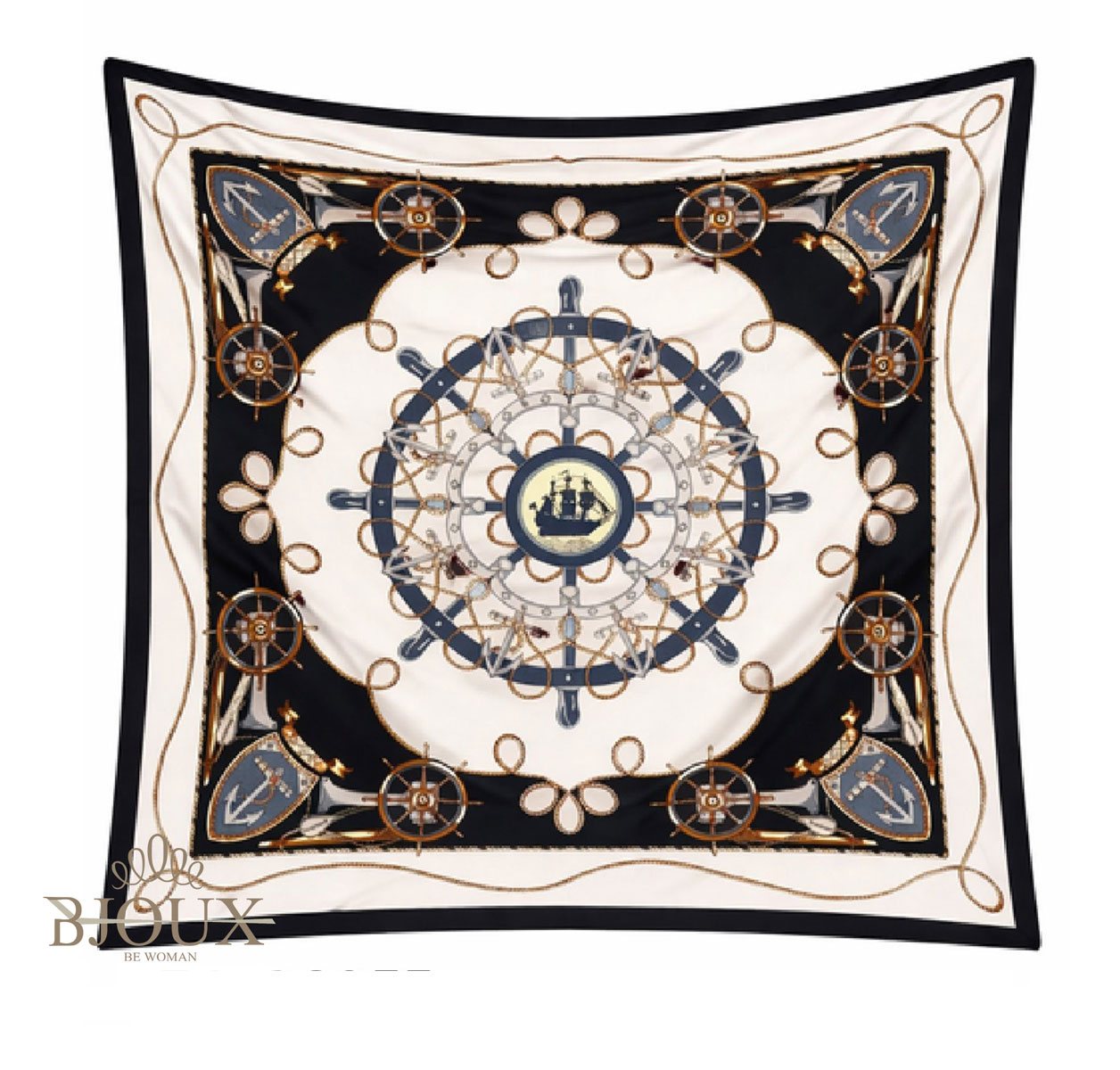Foulard elegante d’ispirazione nautica con dettagli di timoni, ancore e corde nei toni nero, oro e beige. Raffinato e intramontabile, perfetto per look chic e strutturati.