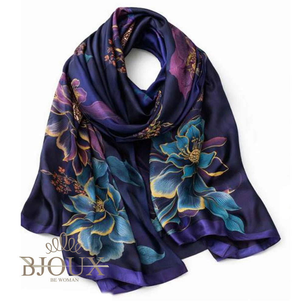 Un mix magnetico di blu e viola con dettagli floreali luminosi. Questo foulard dona subito carattere a qualsiasi outfit, ideale per clienti che amano colori profondi e sofisticati.