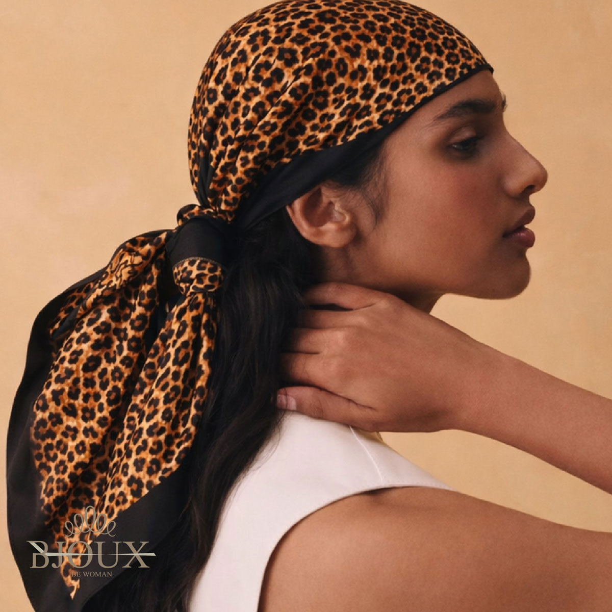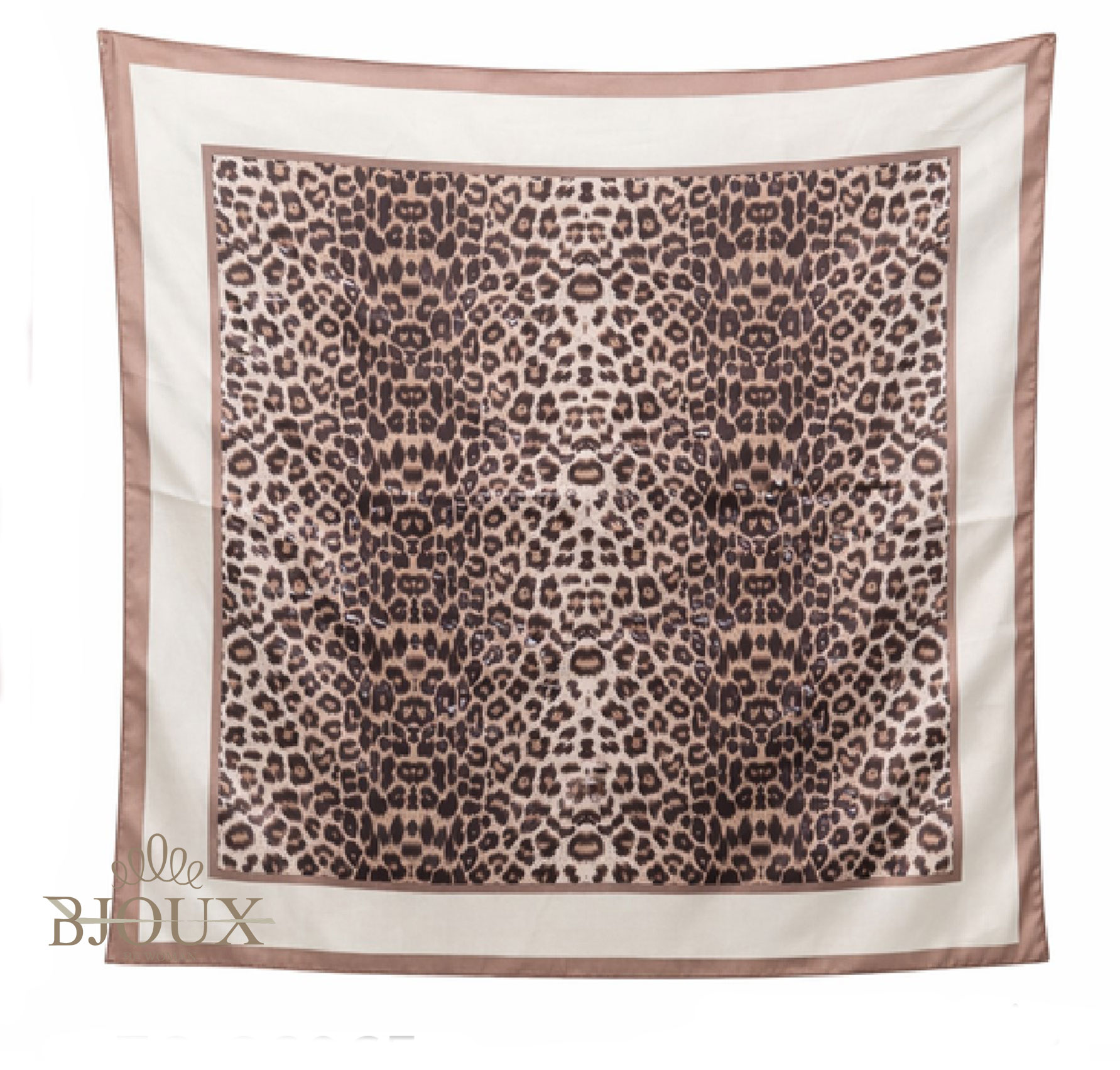 Foulard elegante con stampa animalier su base avorio. Raffinato e luminoso, perfetto per outfit chic e sofisticati.