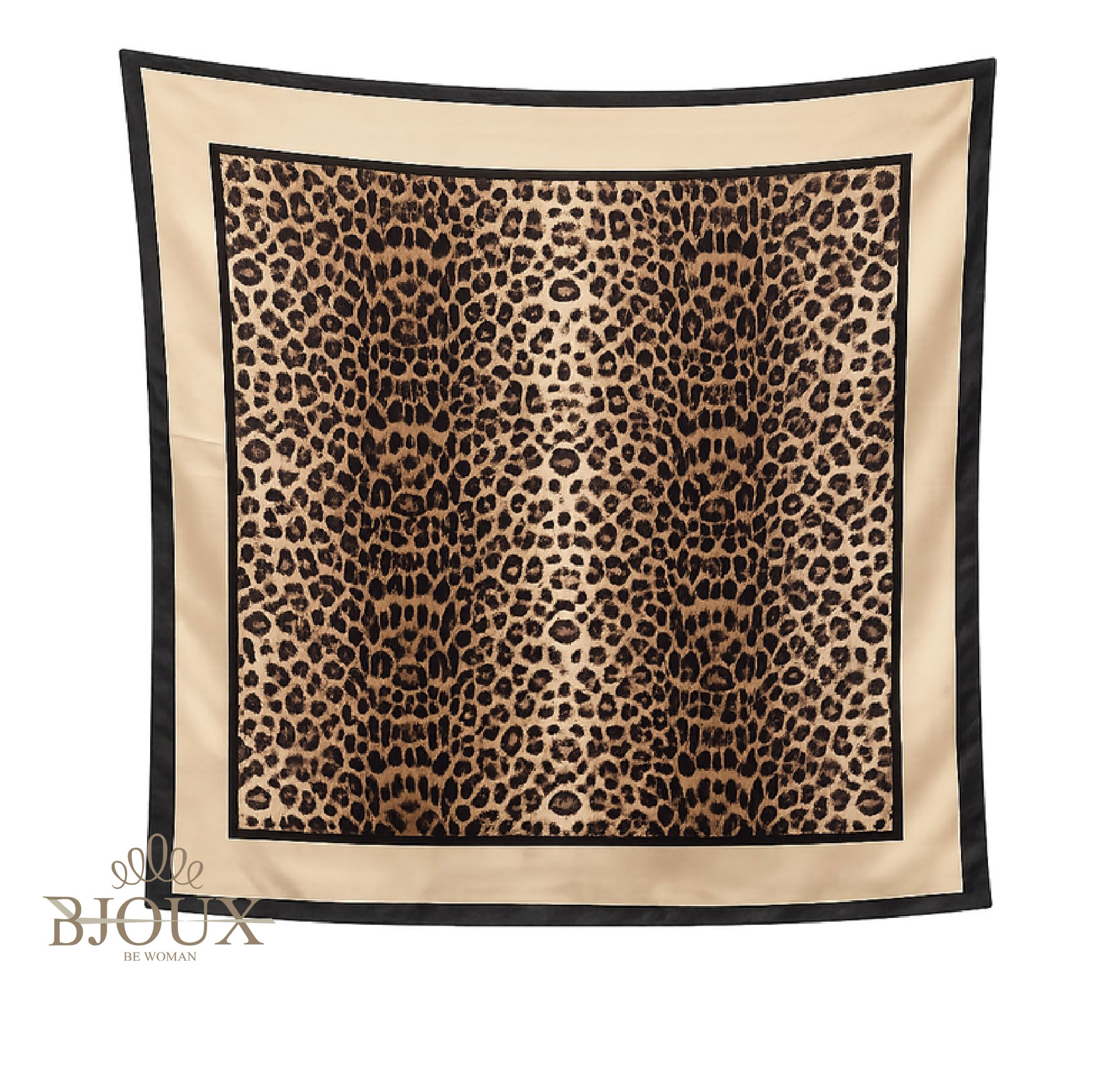 Foulard animalier classico con cornice beige e stampa leopardata intensa. Un grande must della moda, sempre richiesto e sempre venduto.