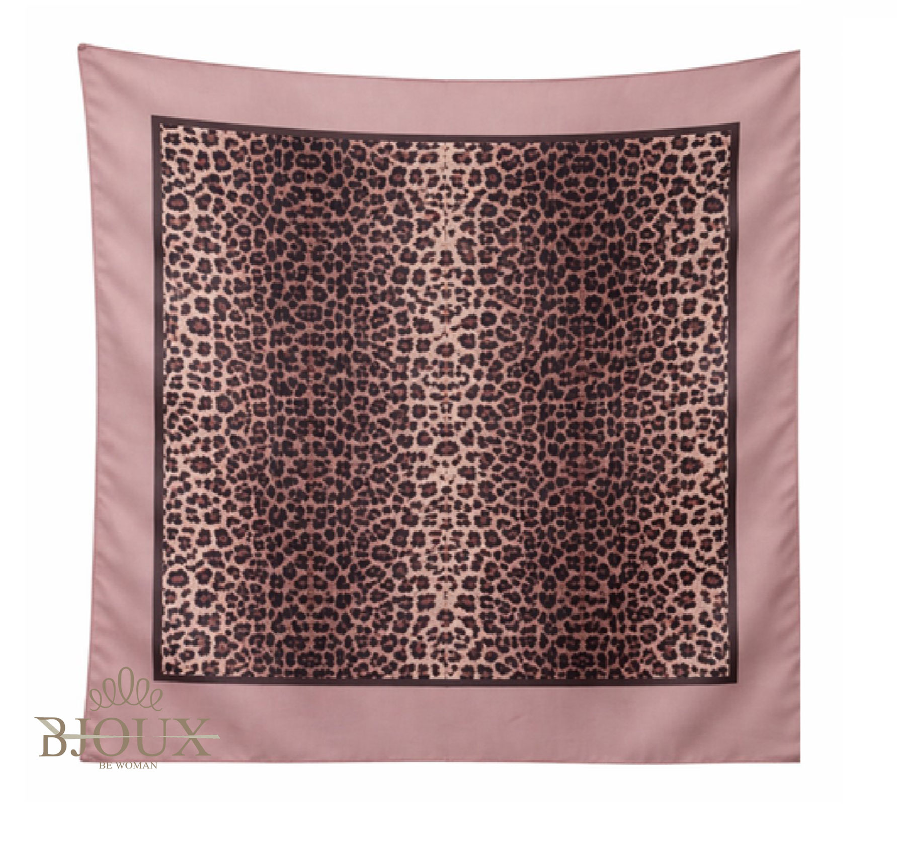 Foulard animalier rivisitato in chiave delicata, con base rosa cipria e stampa leopardata centrale. Femminile, moderno e perfetto per look raffinati.