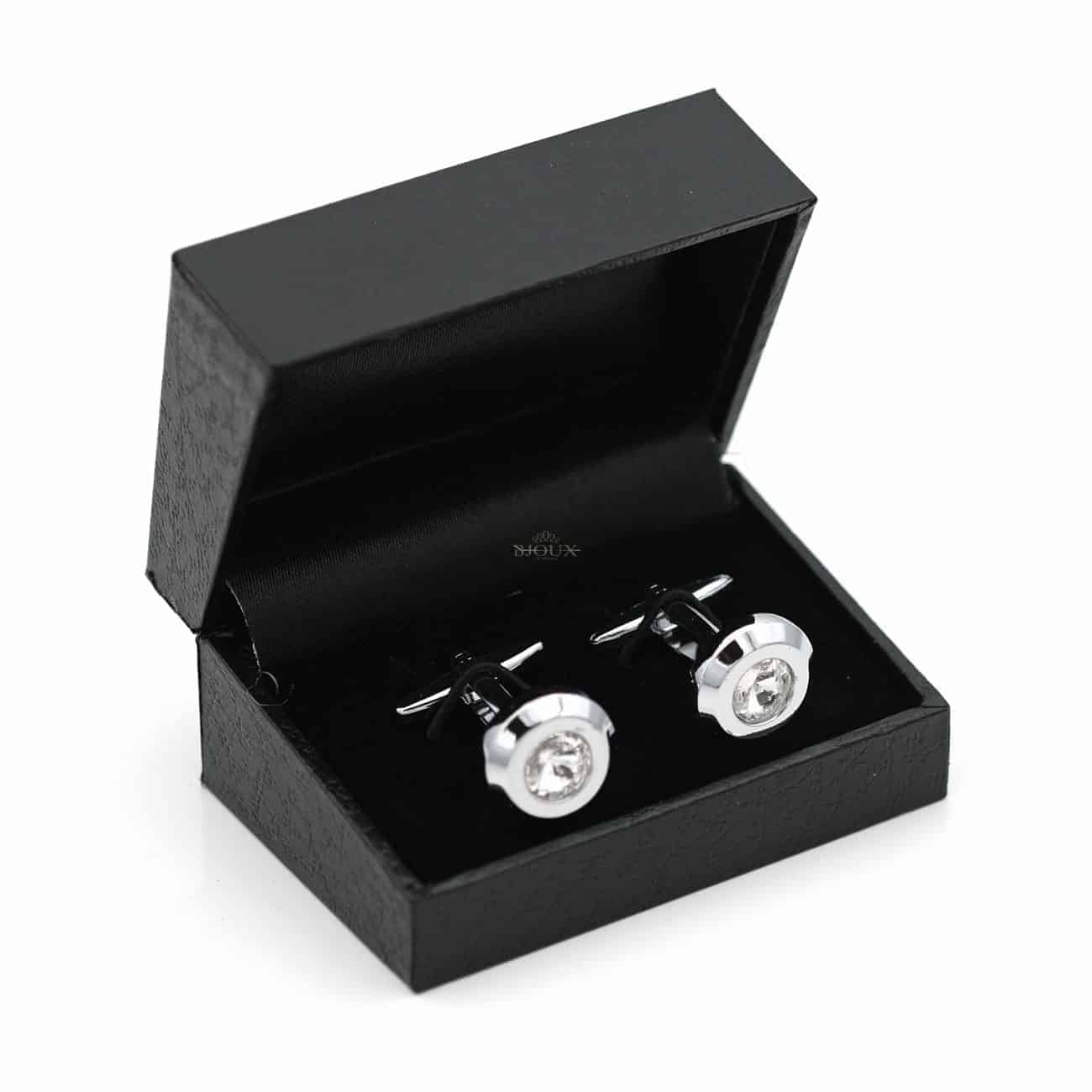 Gemelli da polso per uomo in ottone rodiato con strass centrale jet. Completo di scatolina