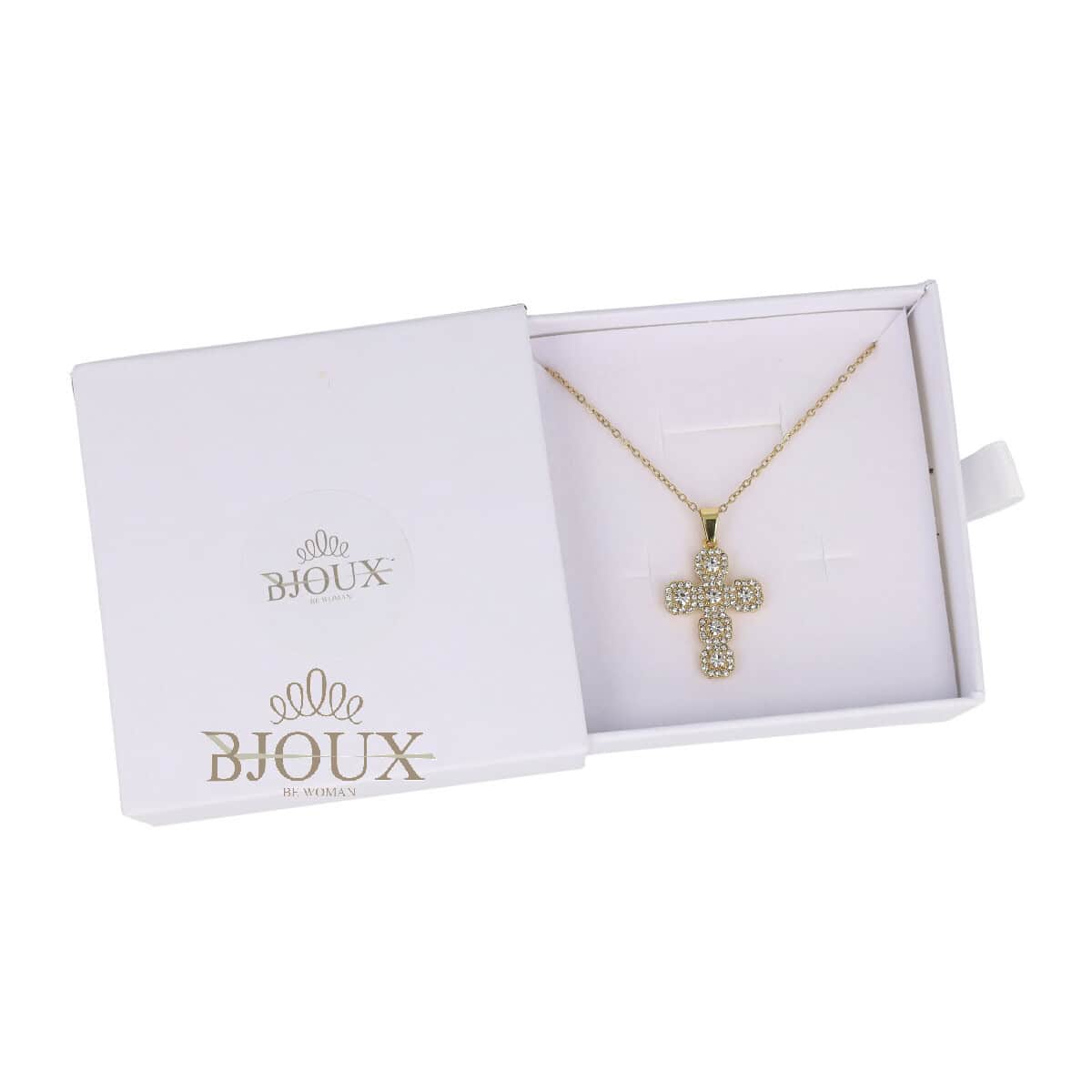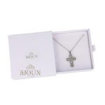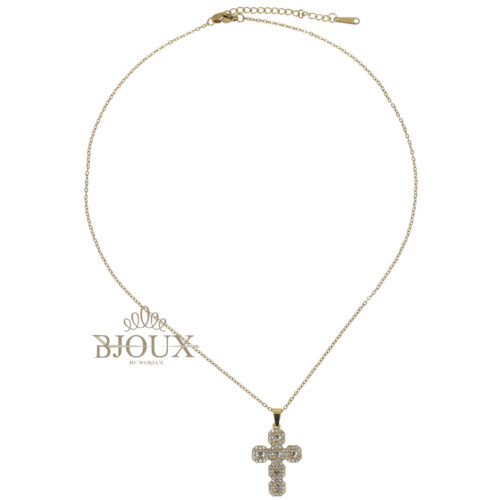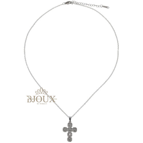 Confezione regalo per donna. Collana con catenina in acciaio inossidabile 40+5 cm con ciondolo pendente in ottone. Ciondolo 2×2 cm decorato da strass. Disponibile in oro o rodio
