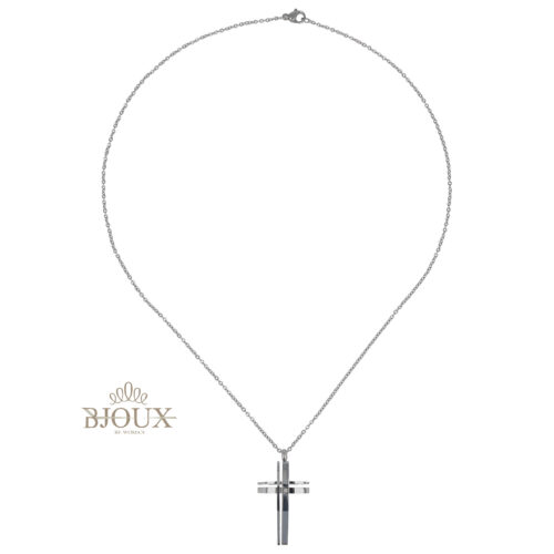 Collana in acciaio inossidabile catena lunga da 50 cm rodiata con croce a due fili da 3 x 2 cm con rivolo strass centrale. In astuccio regalo 9×9