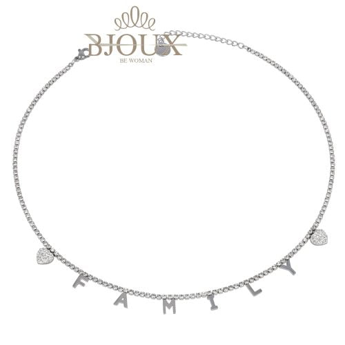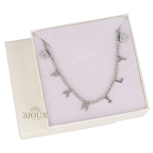 Collana girocollo in acciaio inossidabile con strass e zirconi . Collana con scritta family. In astuccio regalo 9×9