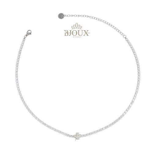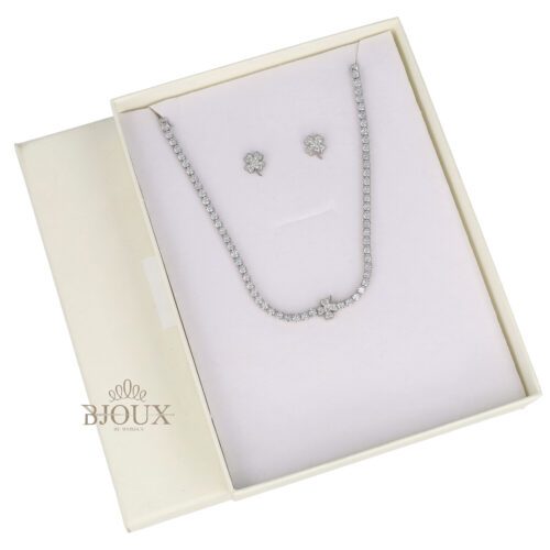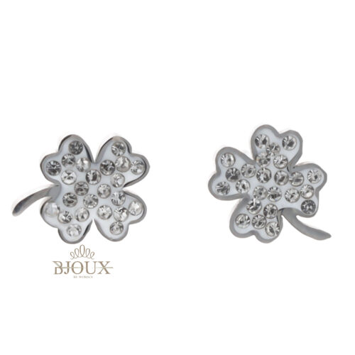 Collana girocollo in acciaio e strass con quadrifoglio abbinata ad orecchini a perno anallergico. In astuccio regalo 12×16