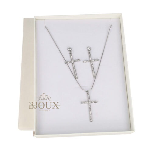 Collana con croce brillantinata 4×2,5 cm con catena coda di topo da 40 cm e Orecchini coordinati con perno e punto luce . Delicati ma dโeffetto, gli orecchini riprendono lo stesso design brillante della collana . Astuccio regalo 20×15