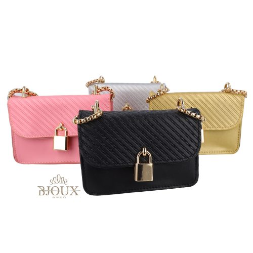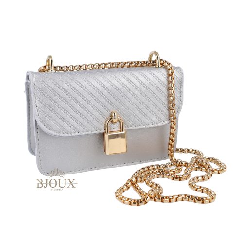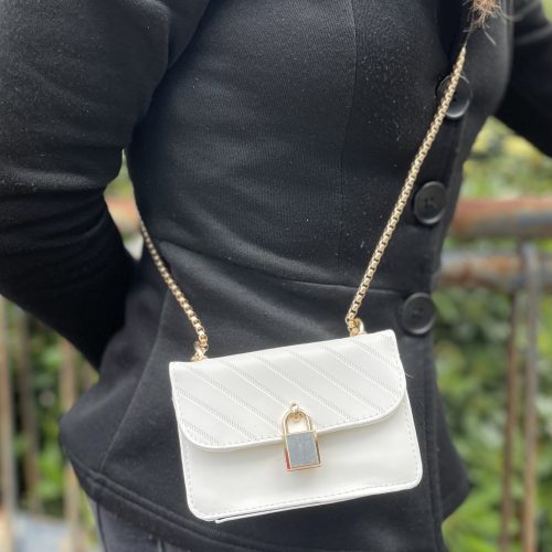 Borsetta da donna in ecopelle effetto lucido con lucchetto in gold e chiusura a bottone Con tracollina catena dorata. Misure 14×9,5×6