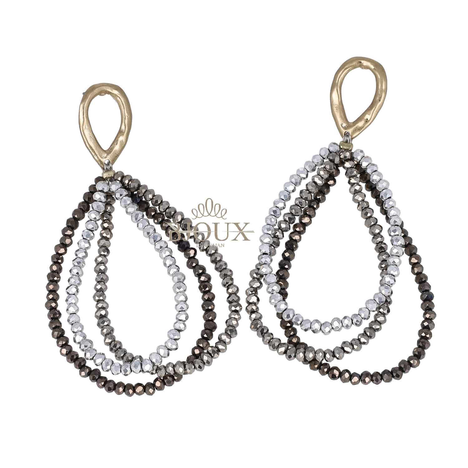 Orecchini bigiotteria con perno in ottone a goccia anticato e pendenti composti da cristallini in vetro colorato.