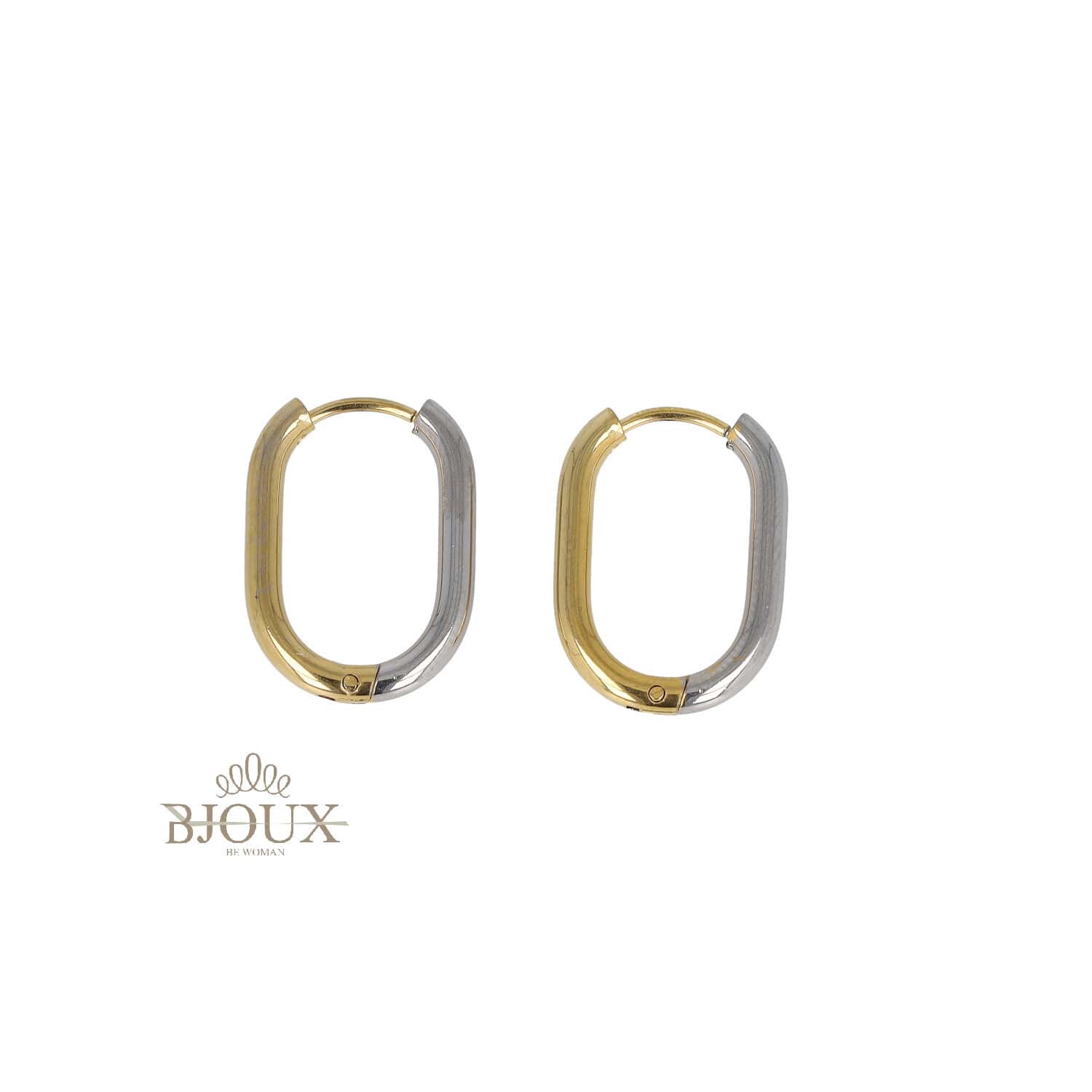 Orecchini in acciaio inossidabile anallergico in due tono a forma ovale. Con chiusura a pressione. Misure 2×1,5 cm