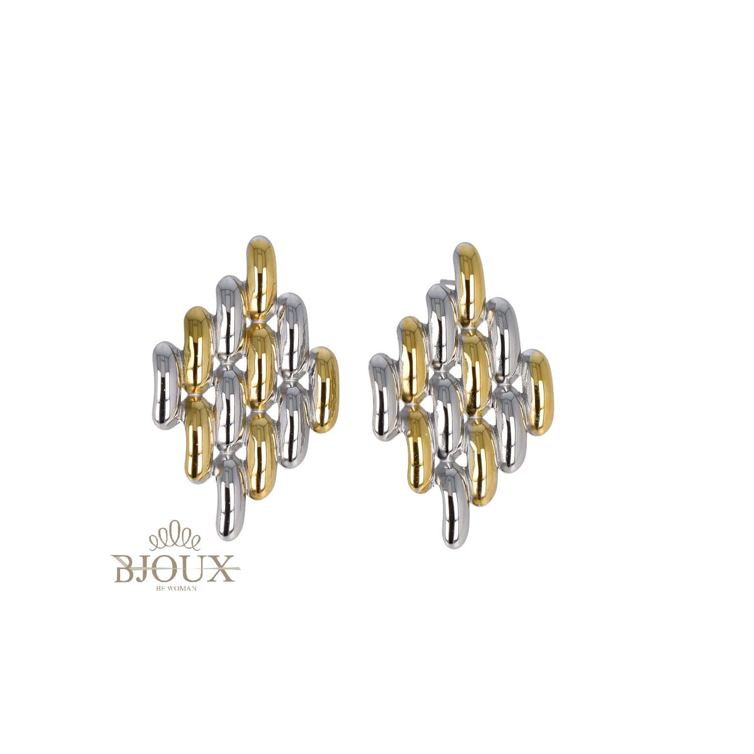 Orecchini donna in acciaio inossidabile anallergico con perno e chiusura a farfallina, rombi a due tondi. 3,5 cm