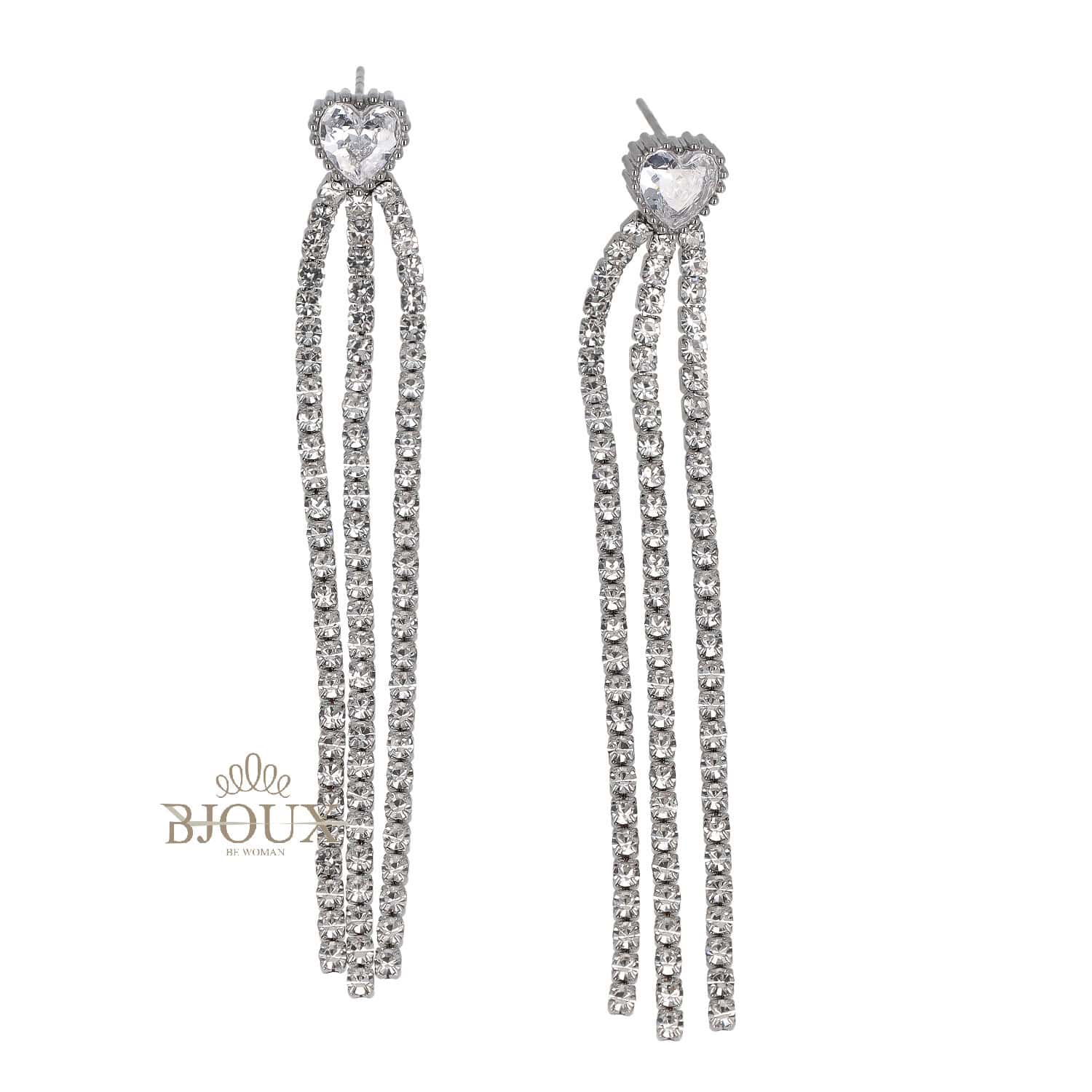 Orecchini pendenti con cuore luminoso e fili di cristalli a cascata. Ideali per serate e cerimonie, donano movimento e brillantezza.