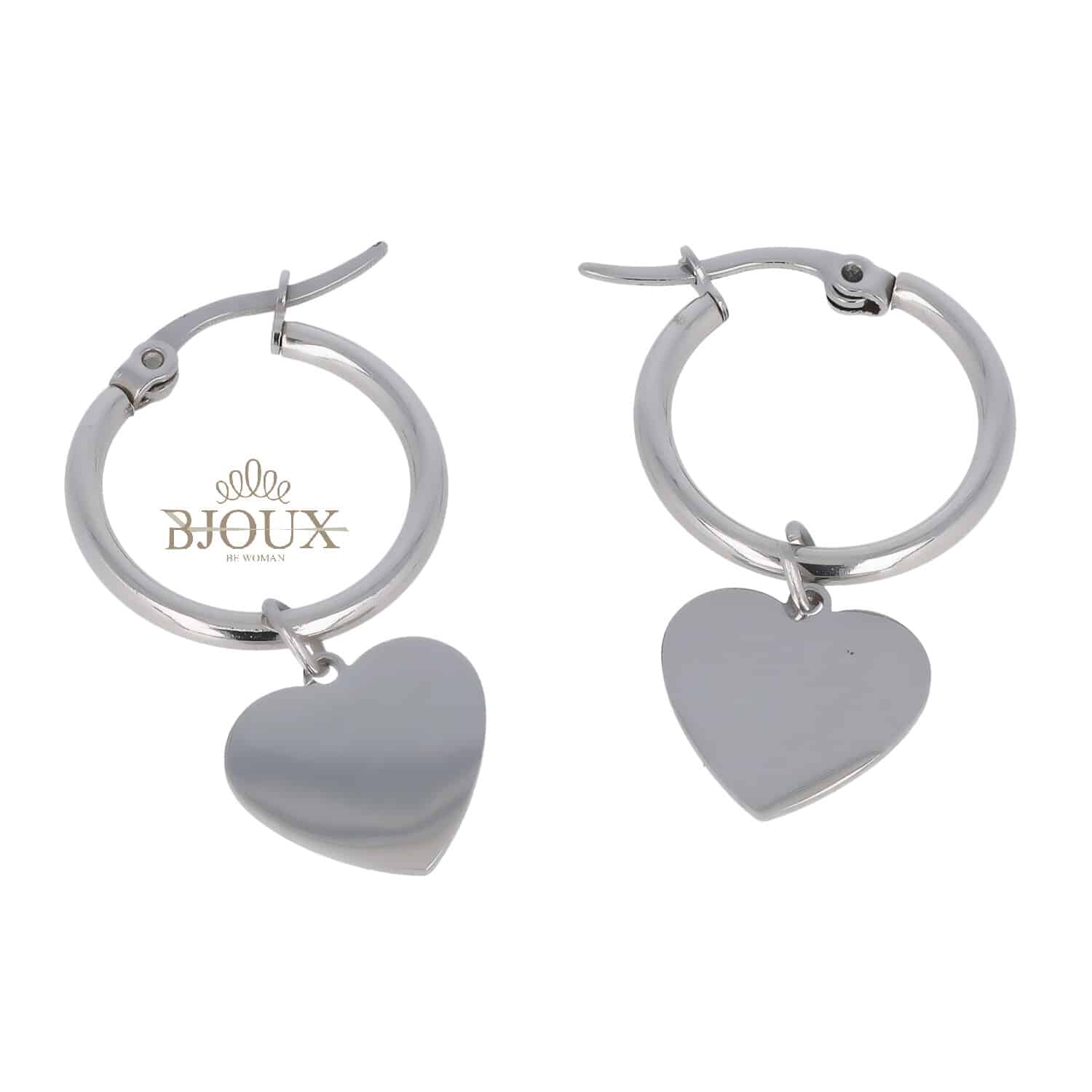 Orecchini in acciaio inossidabile a cerchietto da 20 mm con pendenti cuori. Chiusura a ponte.