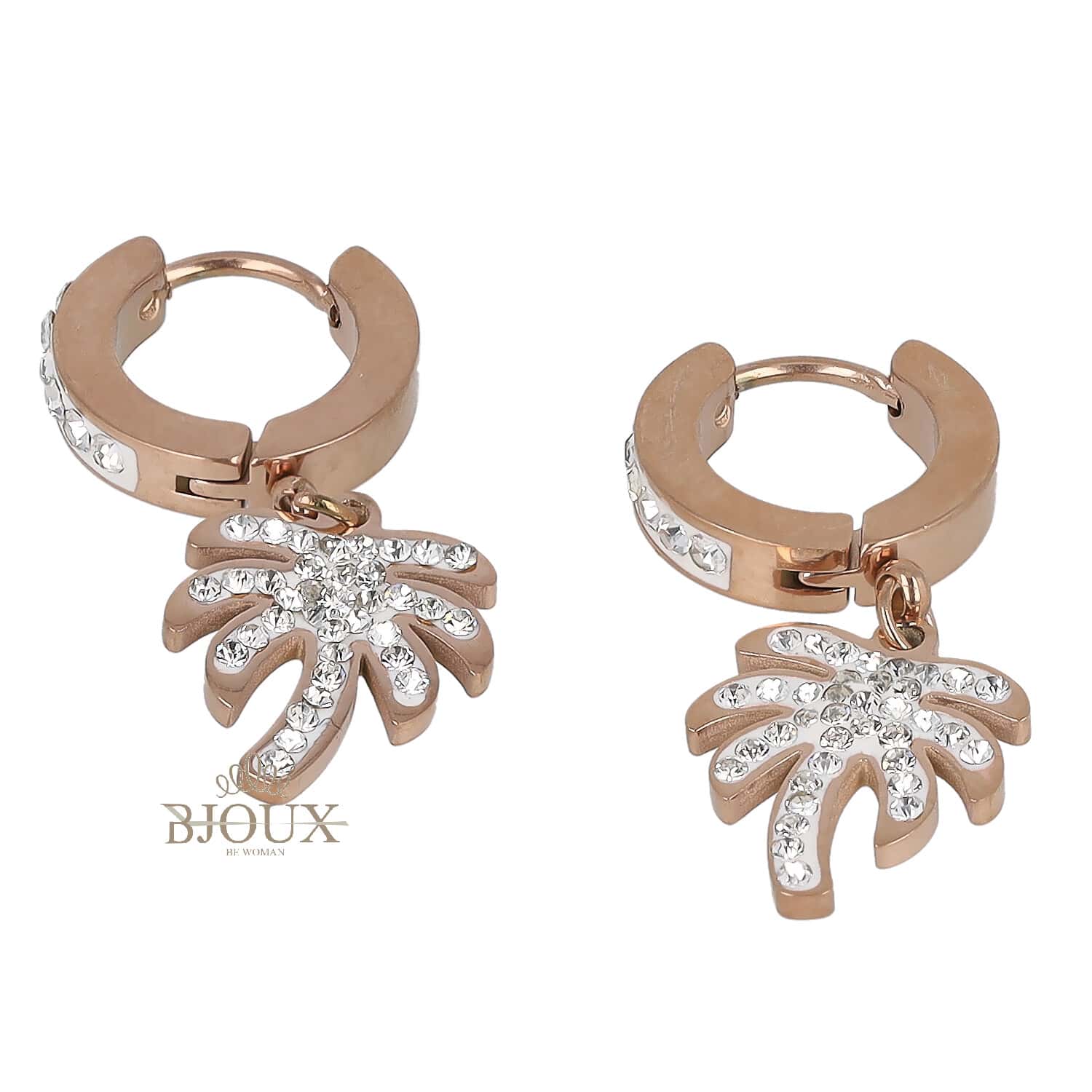 Orecchini in acciaio inossidabile. Orecchini a cerchietto con zirconi con pendente palma media. Colore gold rose.