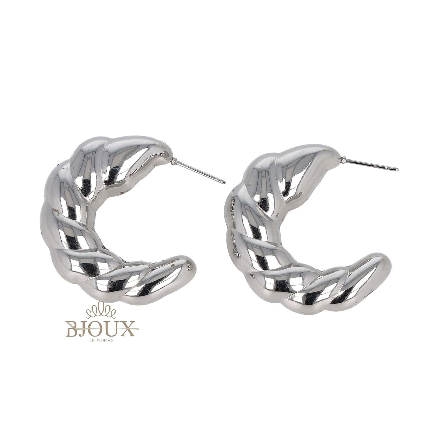 Orecchini a cerchio in acciaio con effetto intrecciato e volume morbido. Un modello moderno e grintoso, ideale per ogni look.