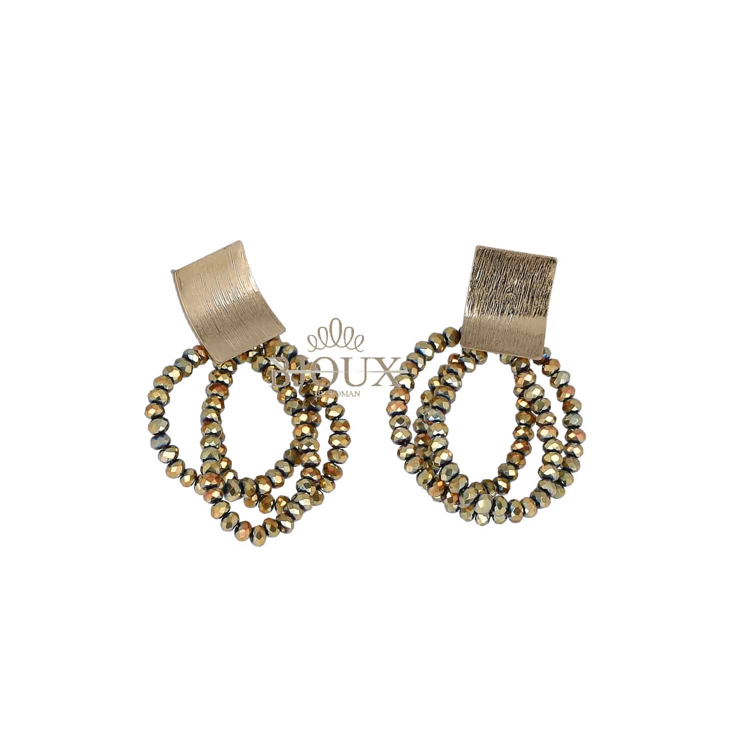 Orecchini bigiotteria con perno in ottone anticati anticato e pendenti composti da cristallini in vetro colorato.