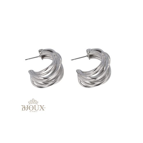 Orecchini bijouxย in acciaio anallergico, con chiusura perno a farfallina. Forma a semicerchio composta da fili acciaio intrecciati. Diametro esterno 25mm, spessore 2 cm