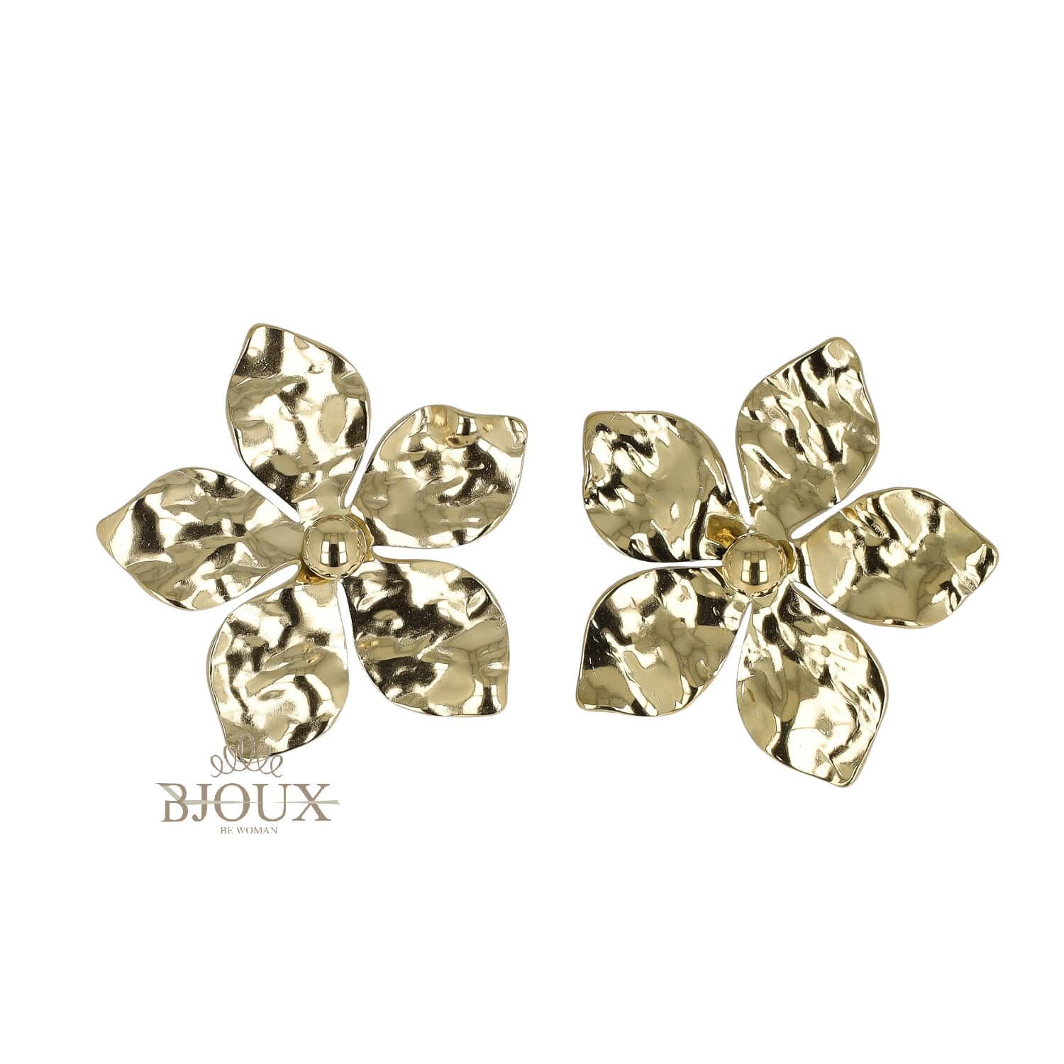 Maxi orecchini a forma di fiore con cinque petali irregolari, effetto martellato. Perfetti per outfit estivi e cerimonie.