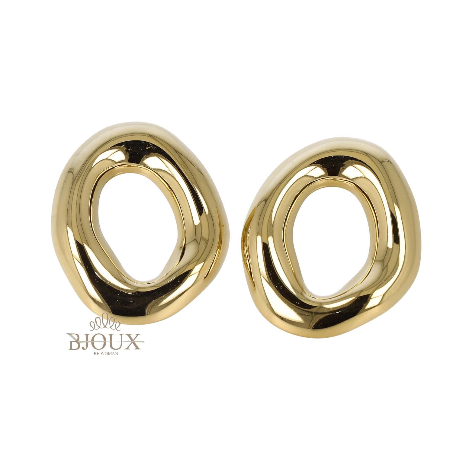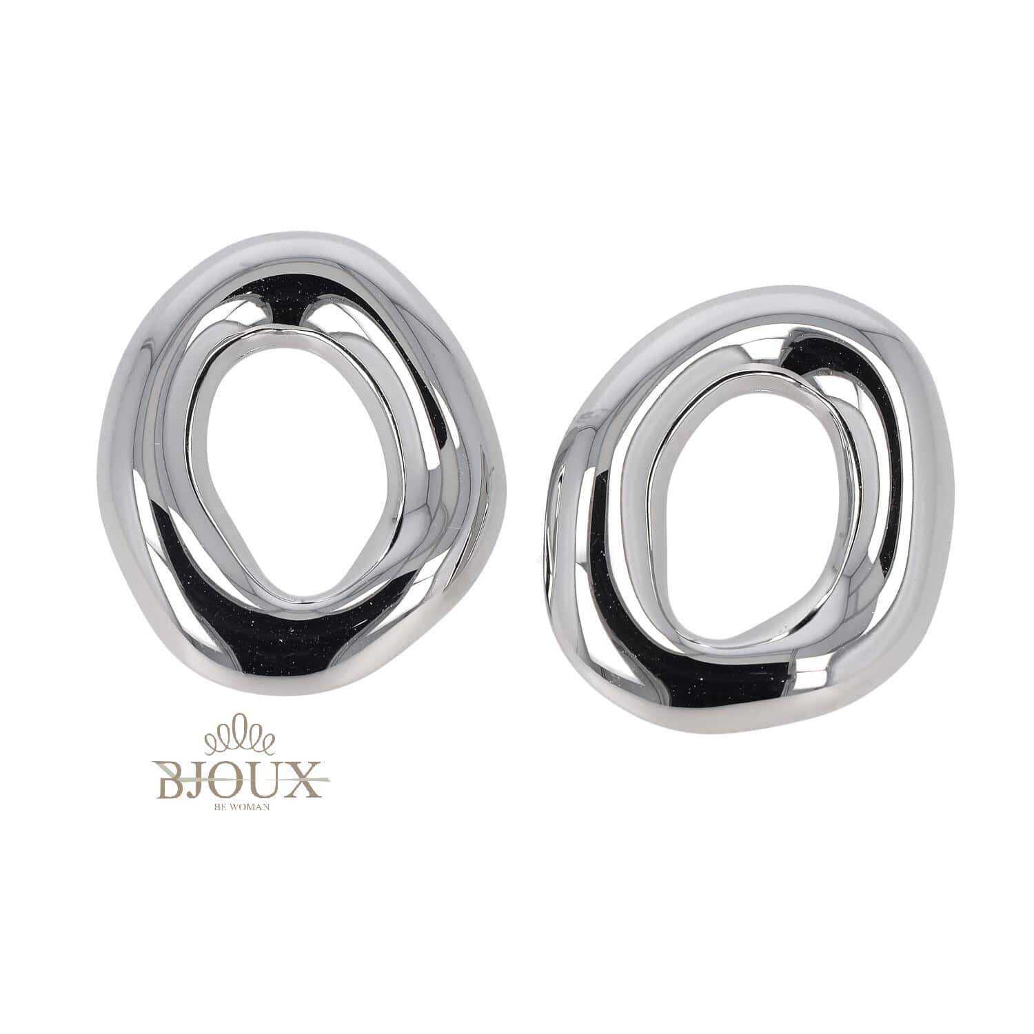 Coppia di orecchini pendenti in acciaio inossidabile con chiusura a farfallina . Forma irregolare ovale da 3,5 cm di diametro circa.