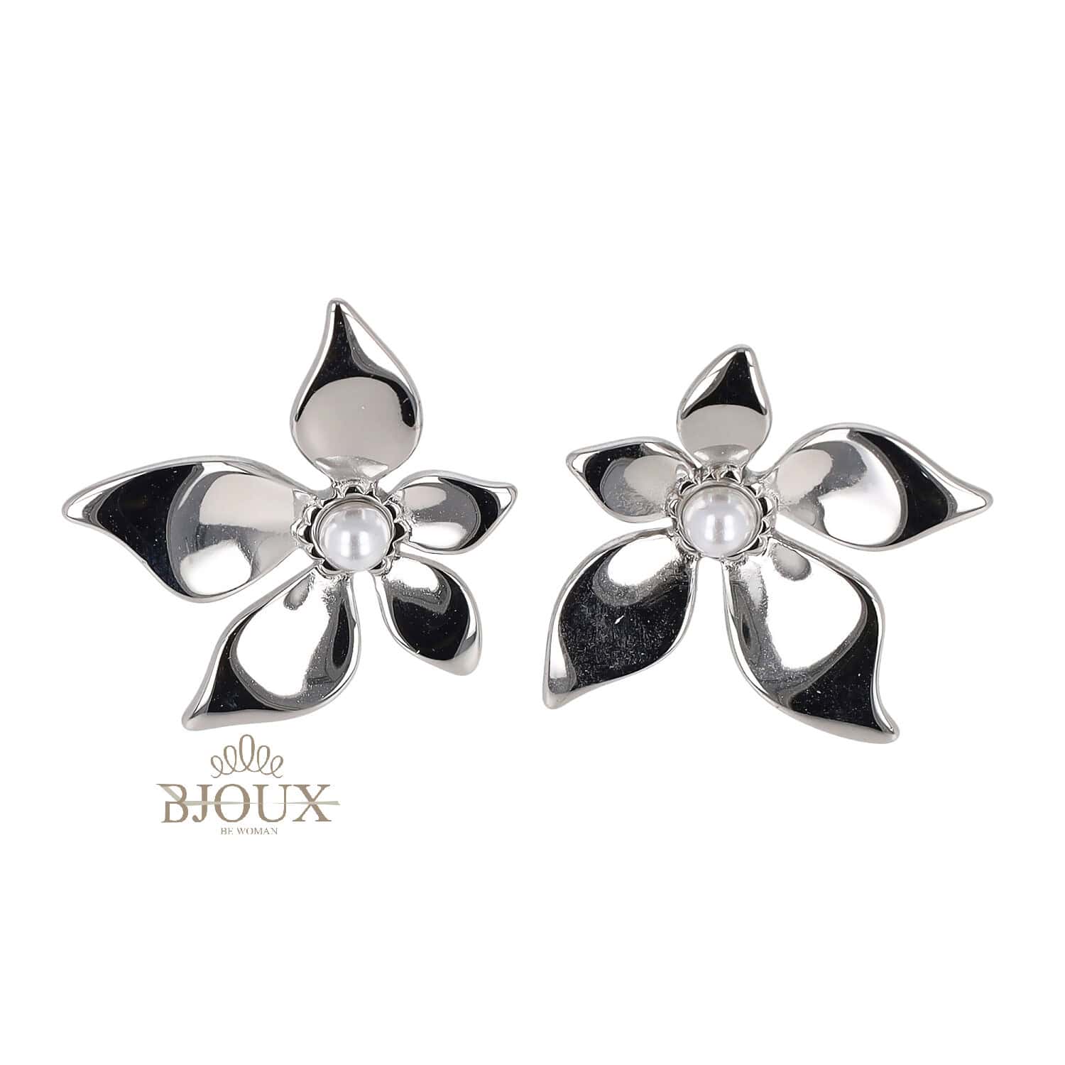 Orecchini in acciaio inox a fiore a cinque petali con perlina centrale decorativa.. Disponibili in oro e argento.