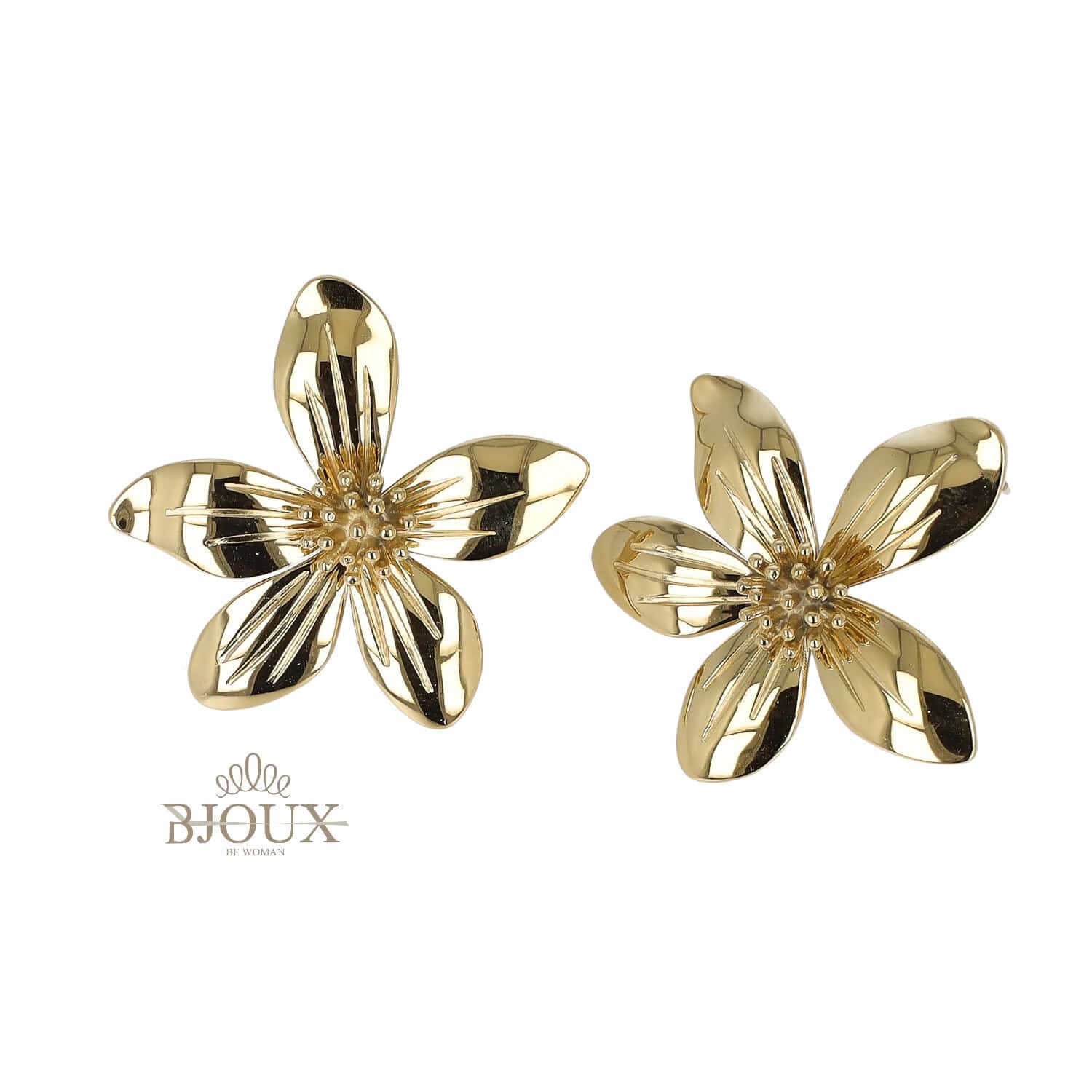 Orecchini in acciaio inox a forma di fiore con petali scolpiti e dettaglio centrale.ย Disponibili in oro e argento.