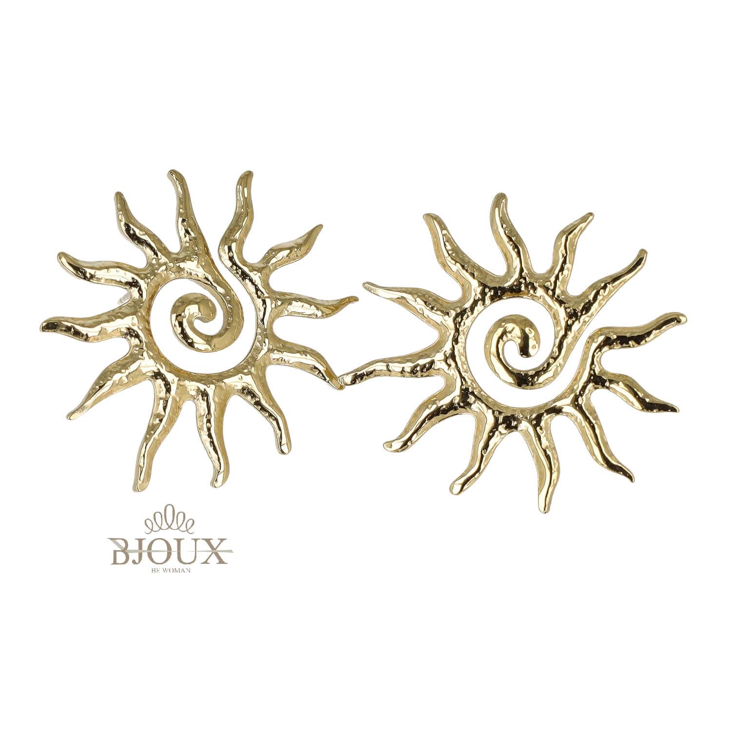 Orecchini in acciaio inox a forma di sole stilizzato con lavorazione martellata e spirale centrale. Orecchini a lobo con perno a farfallina anallergico.