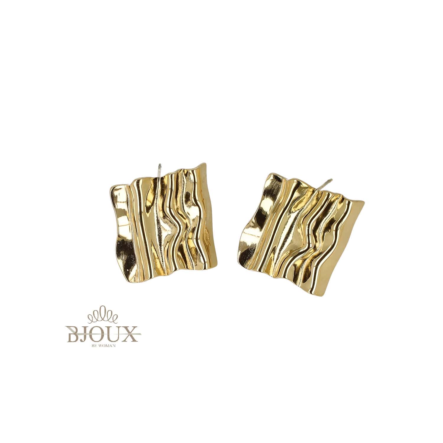 Orecchini in acciaio con placcatura oro/rodio, caratterizzati da una superficie ondulata e luminosa. Design squadrato, ideale per uno stile contemporaneo ed elegante.