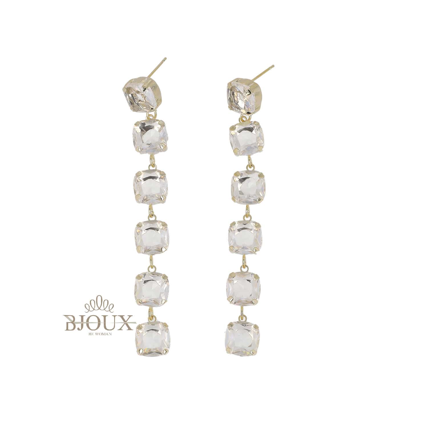 Orecchini lunghi e raffinati composti da una sequenza di cristalli taglio quadrato colorati, montati su base in ottone dorato. Cristalli: Taglio Quadrato Chiusura: Perno con farfallina Lunghezza: 7,5 cm circa