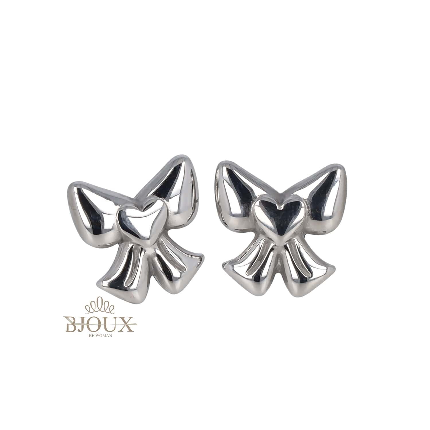 Orecchini di bigiotteria donna in acciaio inossidabile anallergico. Orecchini con perno e fiocco con cuoricino da 1,5 cm