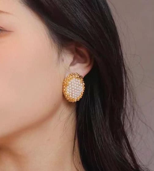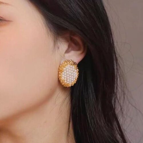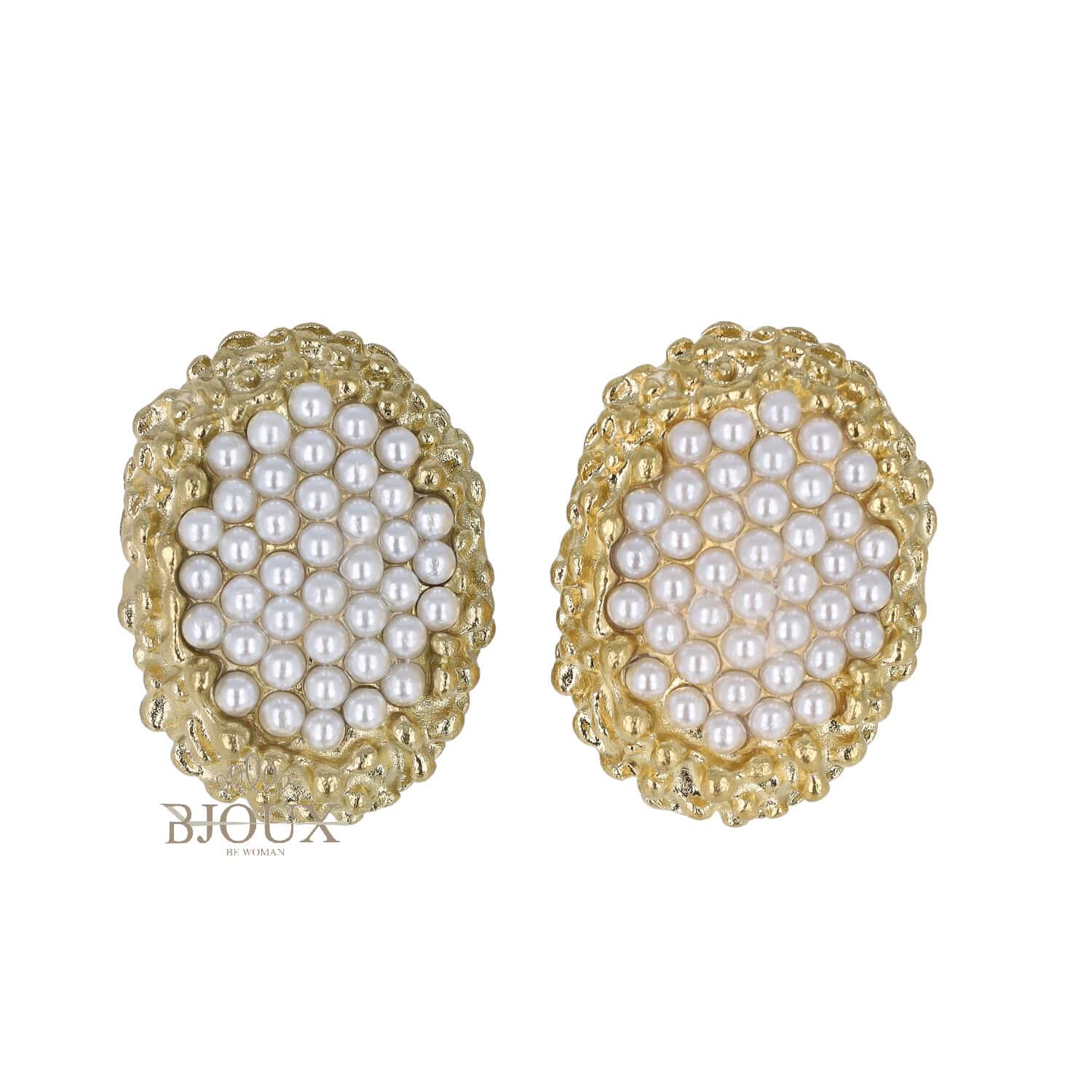 Orecchini da donna in acciaio inox con perno scudo con decoro di perline bianche 3,5×2,5 cm. Colore oro o rodio