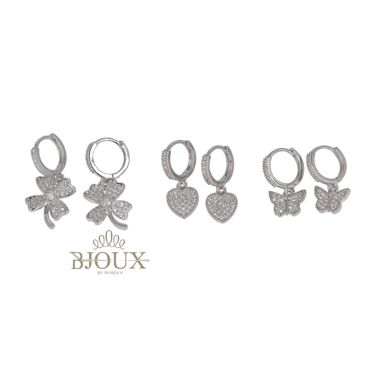 Set di orecchini in ottone anallergico. Set da tre coppie di orecchini a cerchietto con chiusura a pressione decorati da strass laterali, con charms pendenti quadrifoglio 2 cm , cuoricino 1 cm e farfalla 0.8 cm