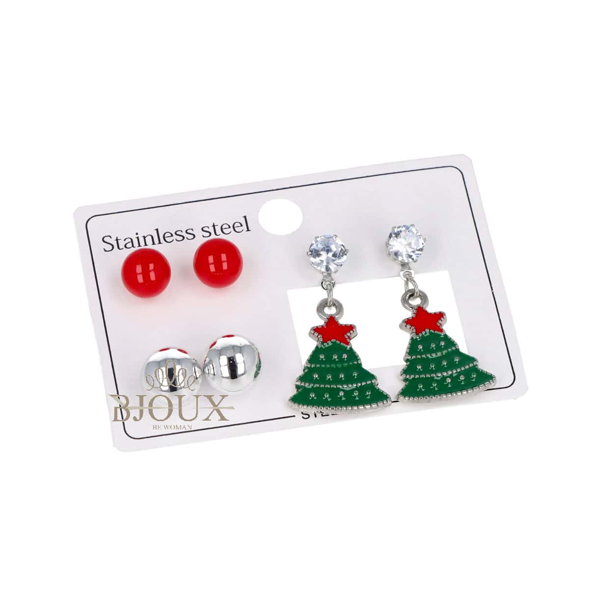 Set di tre paia di orecchini: perle rosse, perle dorate e pendenti con alberi di Natale. Un mix festivo per ogni look delle feste. Perline rosse 5 mm / perline oro 7 mm / pend. 3 cm