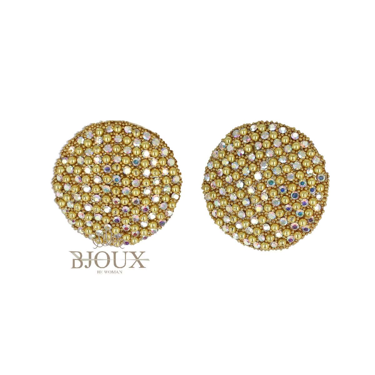 Orecchini bijoux in ottone anallergico dipinto in gold e rodio con applicazione di pietre strass. Perno con farfallina. Diametro 3 cm
