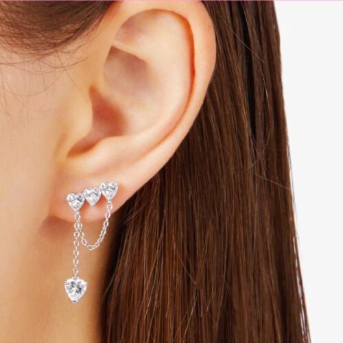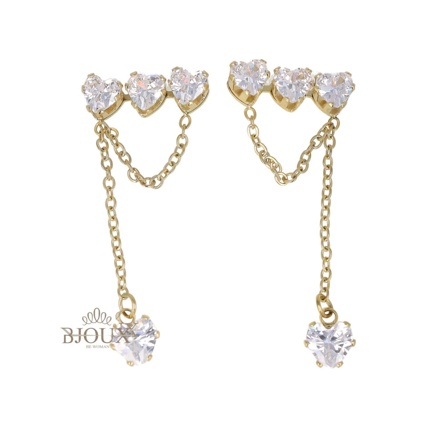 Orecchini di bigiotteria. Orecchini acciaio inossidabile a lobo con tre cuori castoni strass kry con catenina pendente e cuoricino. Lunghezza massima 4 cm