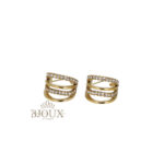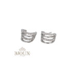 Orecchini in acciaio con struttura a “J” o a mezzo cerchio che avvolge elegantemente il lobo. Due delle quattro fasce sono impreziosite da un pavé di strass scintillanti