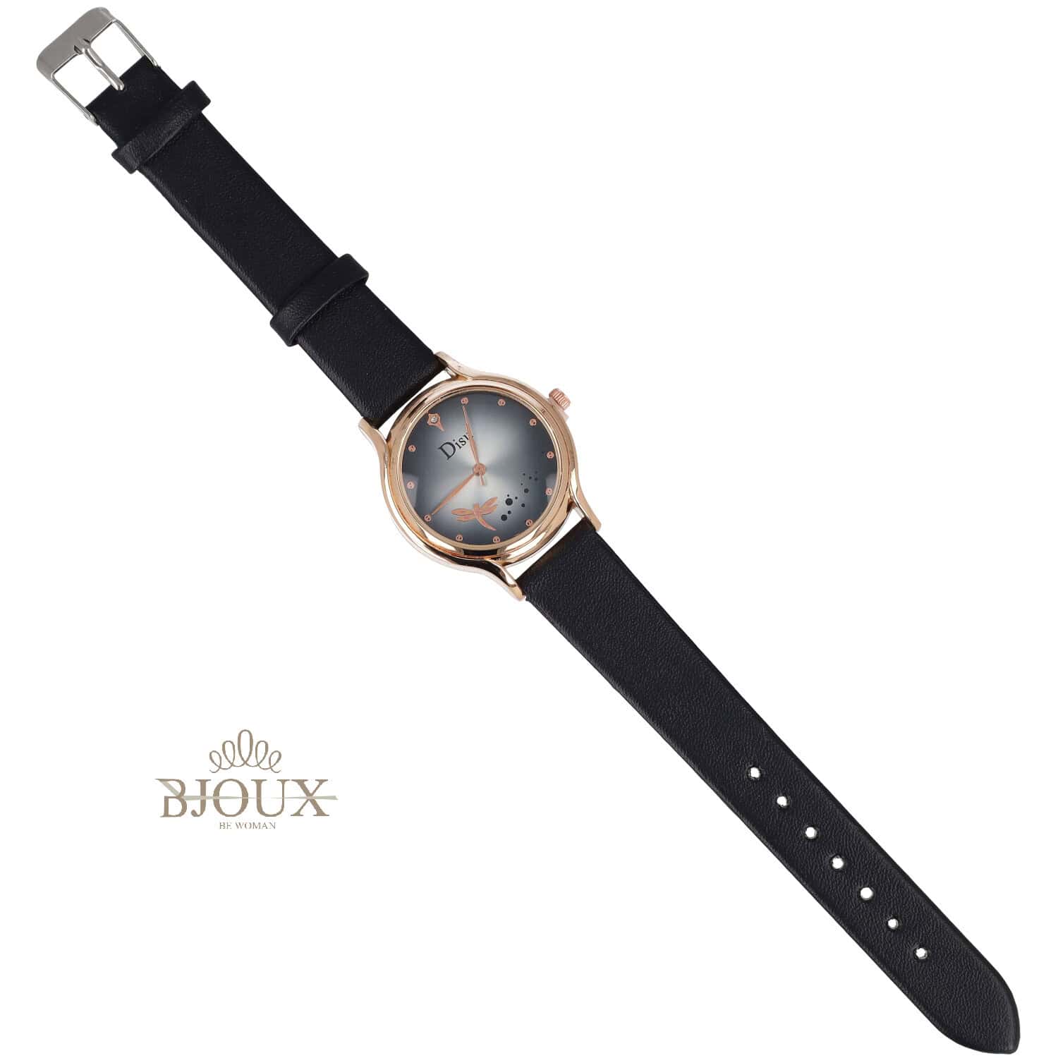 Orologio donna con cinturino ecopelle nera e quadrante in ottone , sfumato grigio e nero con libellulla oro rosa, cassa acciaio da 3 cm