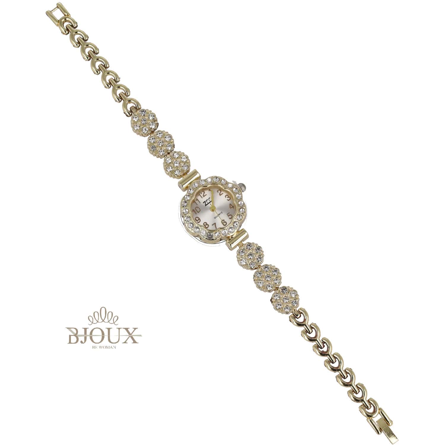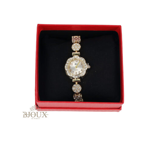 Orologio donna con cinturino in ottone dipinto decorato da pietre strass e punti luce. Cassa in acciaio con quadrante decorato diametro 1,5 cm
