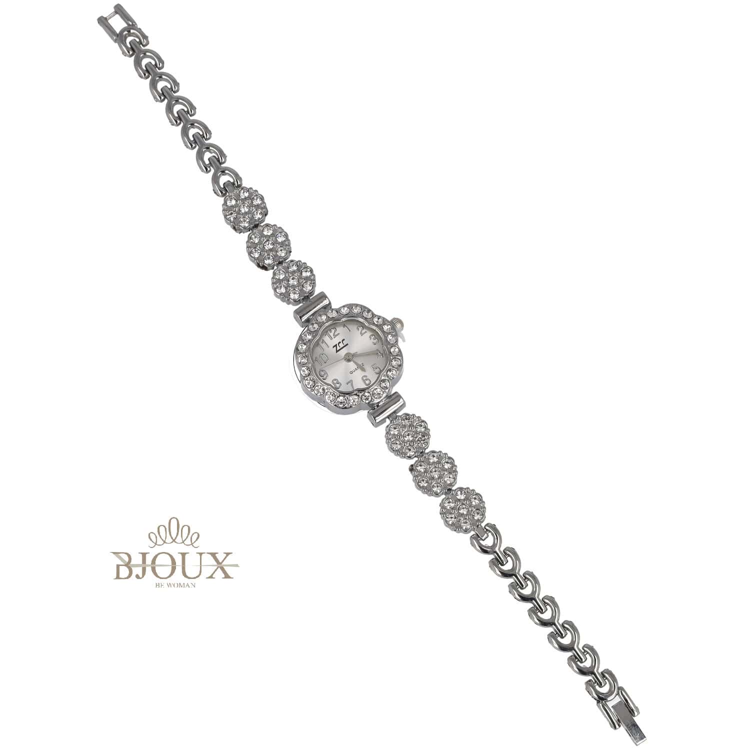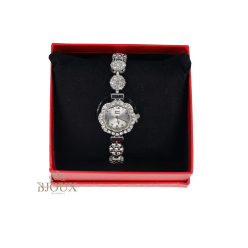 Orologio donna con cinturino in ottone dipinto decorato da pietre strass e punti luce. Cassa in acciaio con quadrante decorato diametro 1,5 cm