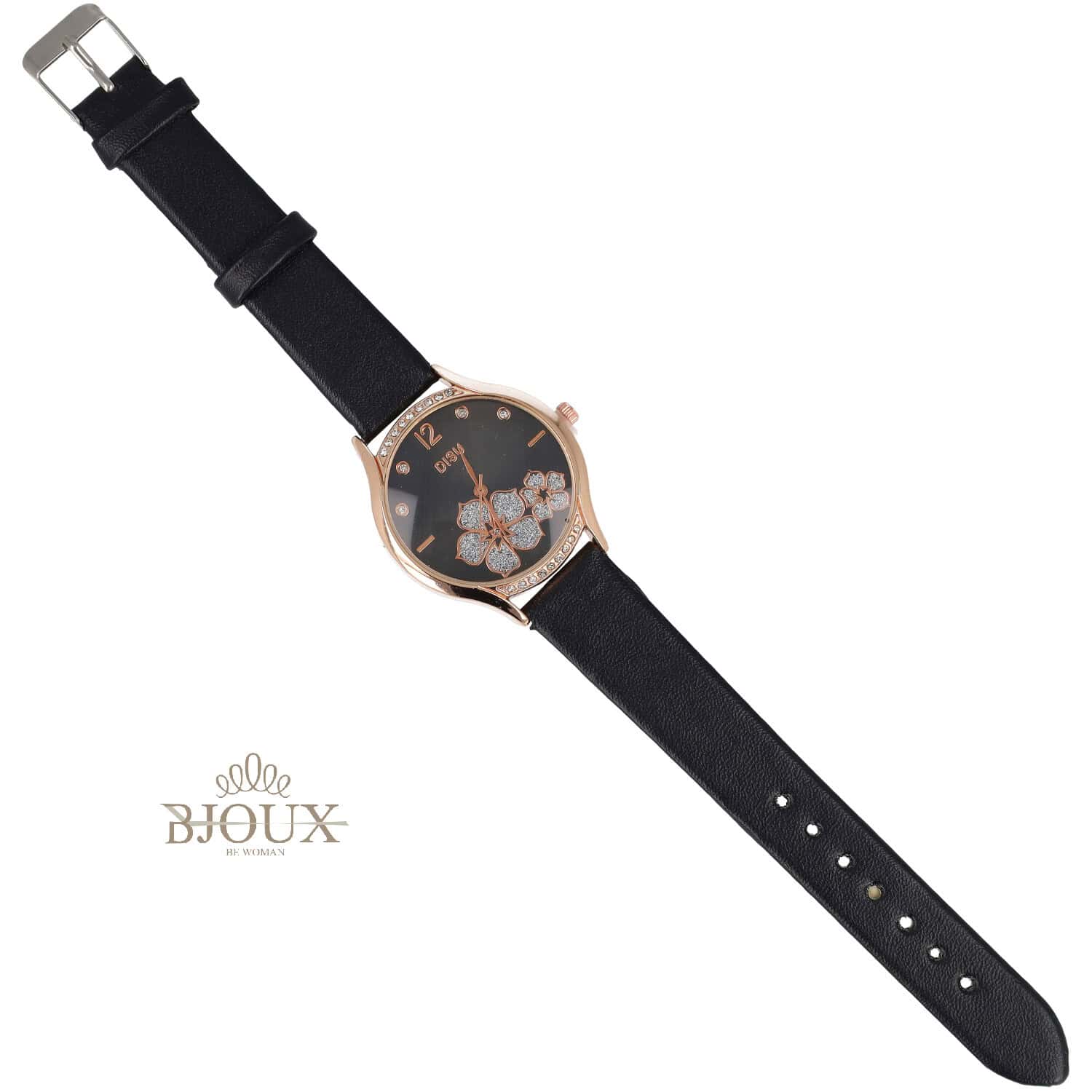 Orologio donna con cinturino ecopelle nera e quadrante in ottone gold rose con due fiori luminosi, cassa acciaio da 3 cm