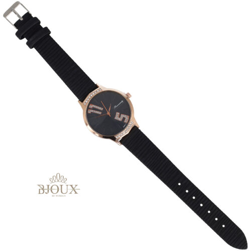 Orologio donna con cinturino ecopelle nera e quadrante in ottone gold rose con numeri grandi e dettagli luminosi , cassa acciaio da 3 cm