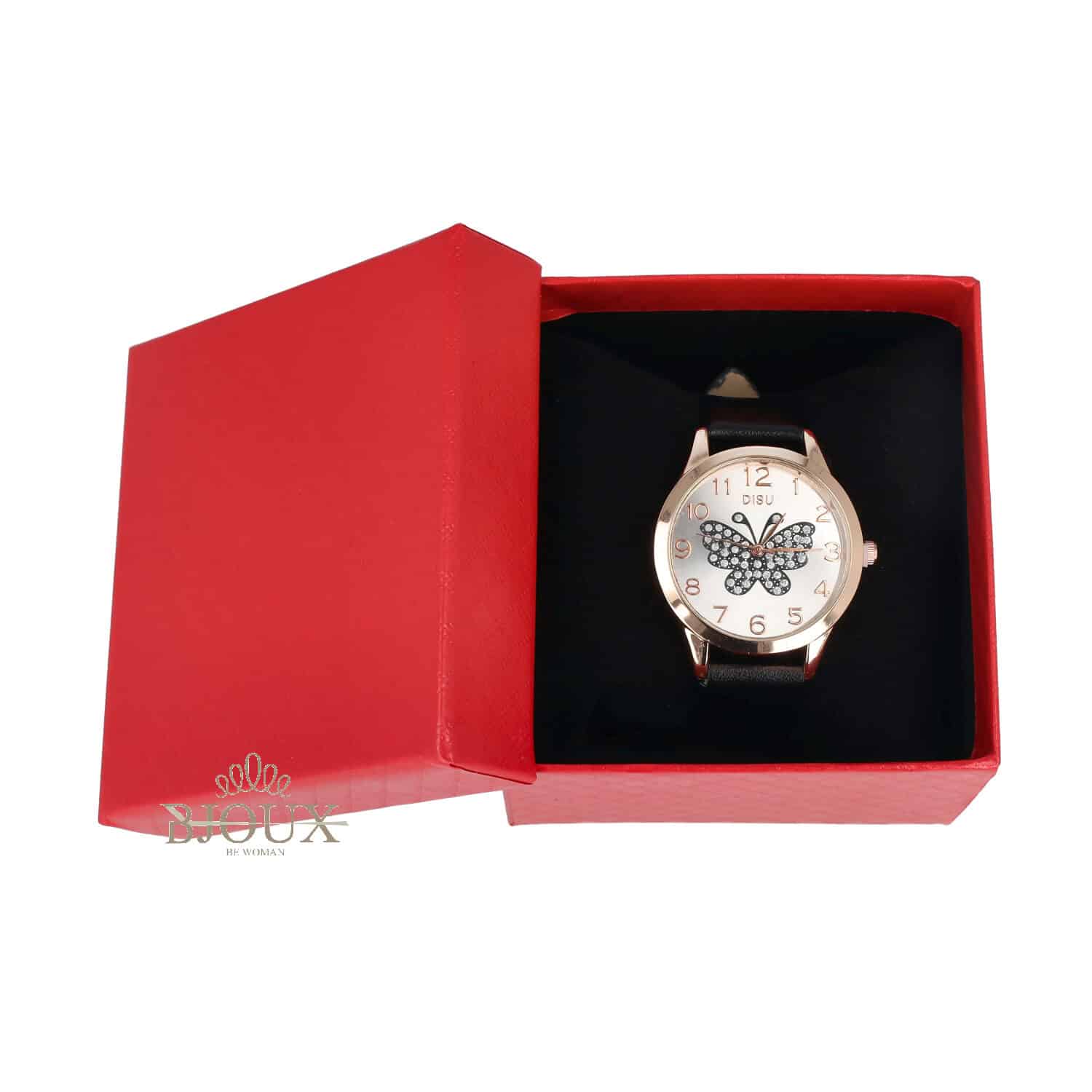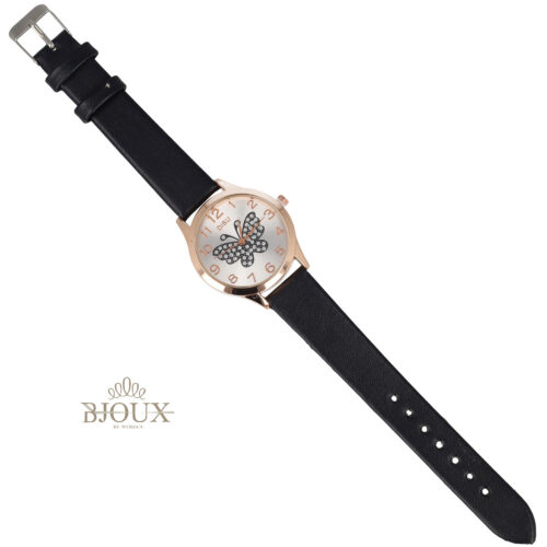 Orologio donna con cinturino ecopelle nera e quadrante in ottone gold rose, con rappresentazione farfalla centrale brillantinata, cassa acciaio da 3 cm