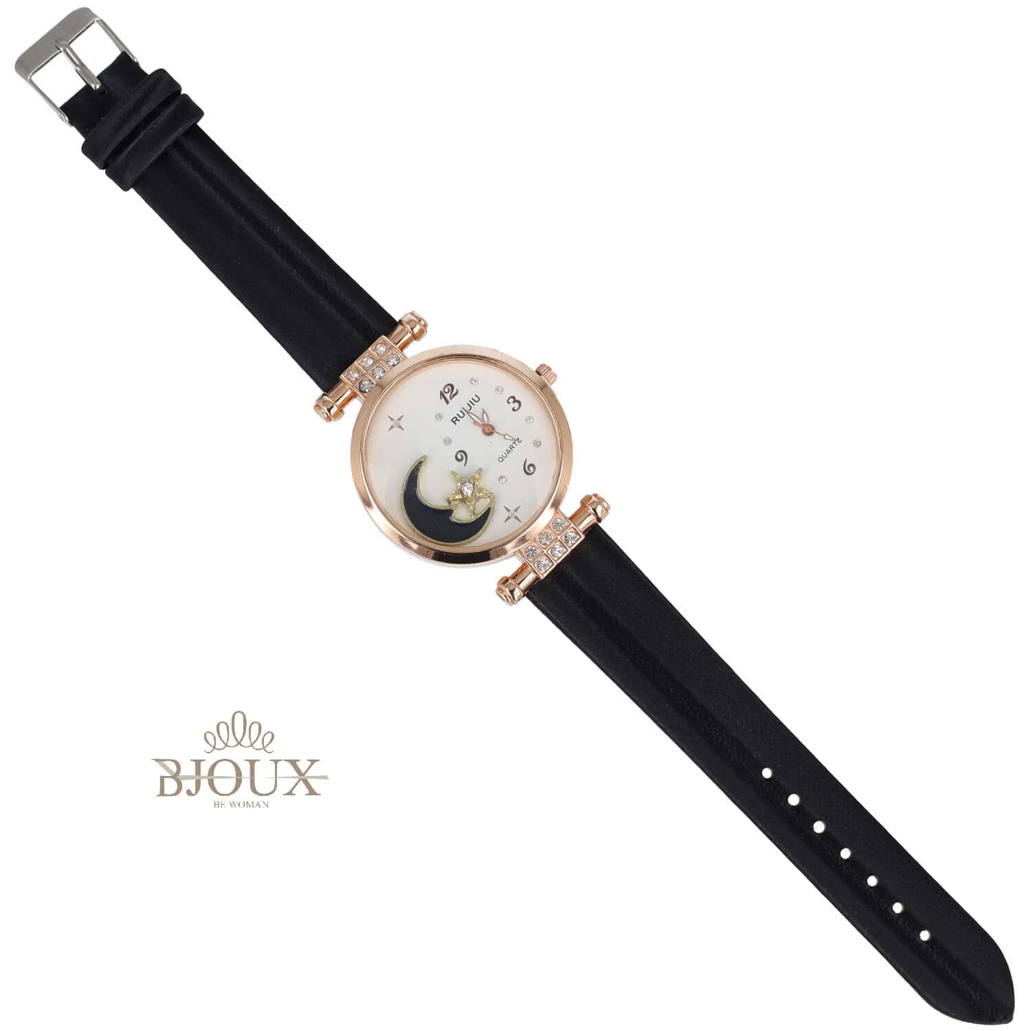 Orologio donna con cinturino ecopelle nera e quadrante in ottone , con cornice di strass scintillanti , quadrante bianco con sagoma lunaย smaltata e stella,ย cassa acciaio da 3,5 cm