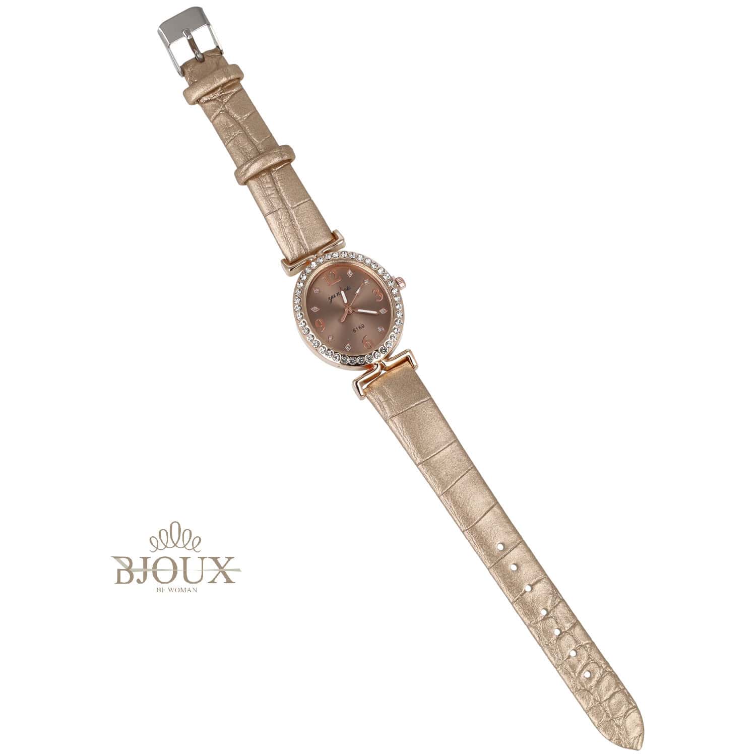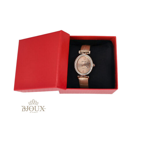 Orologio donna con cinturino ecopelle quadrante in ottone dorato , forma ovale con strass , quadrante conย cassa acciaio da 3 cm