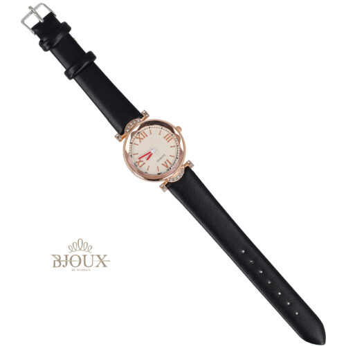 Orologio donna con cinturino ecopelle nera e quadrante in ottone gold rose, elegante con numeri romani, cassa acciaio da 3 cm
