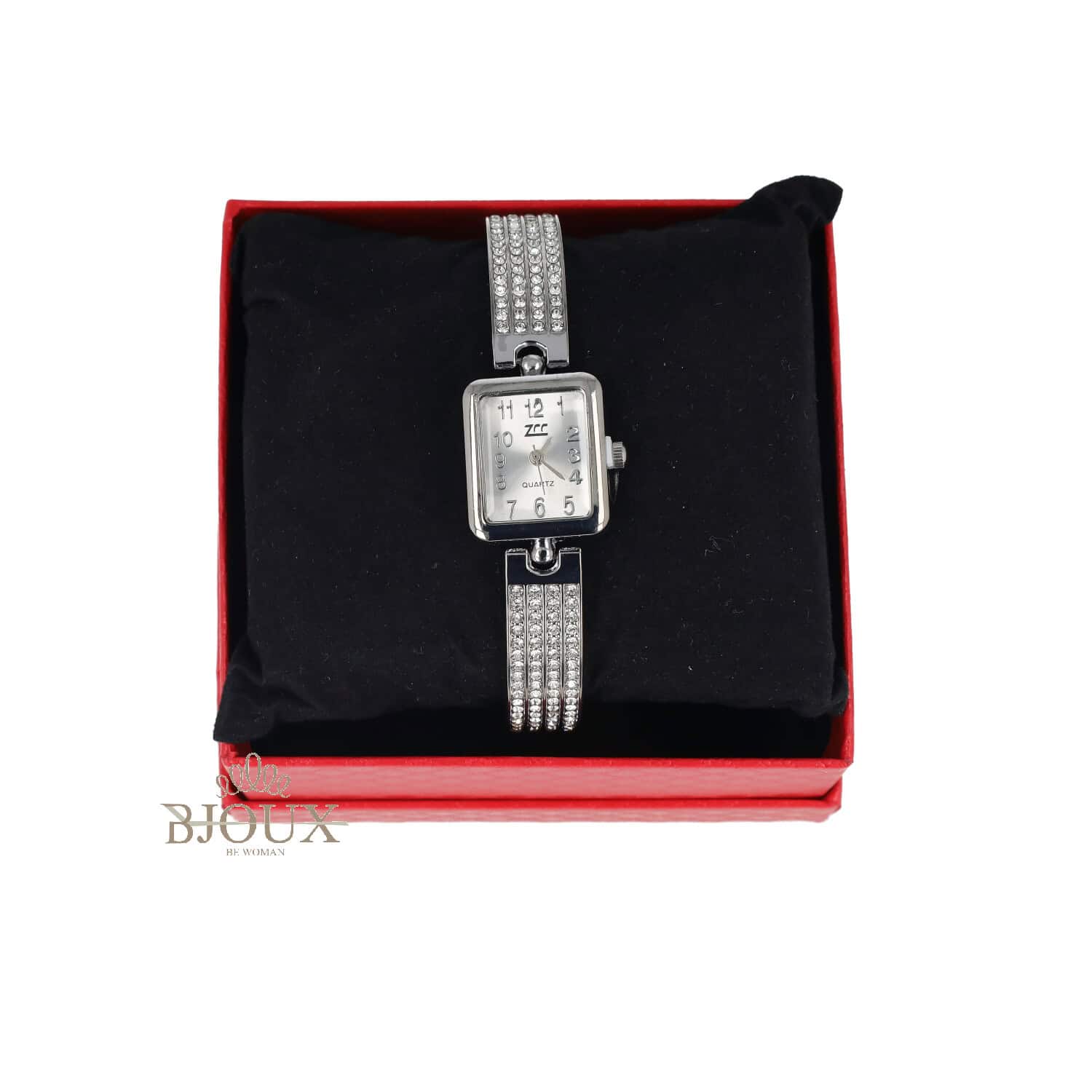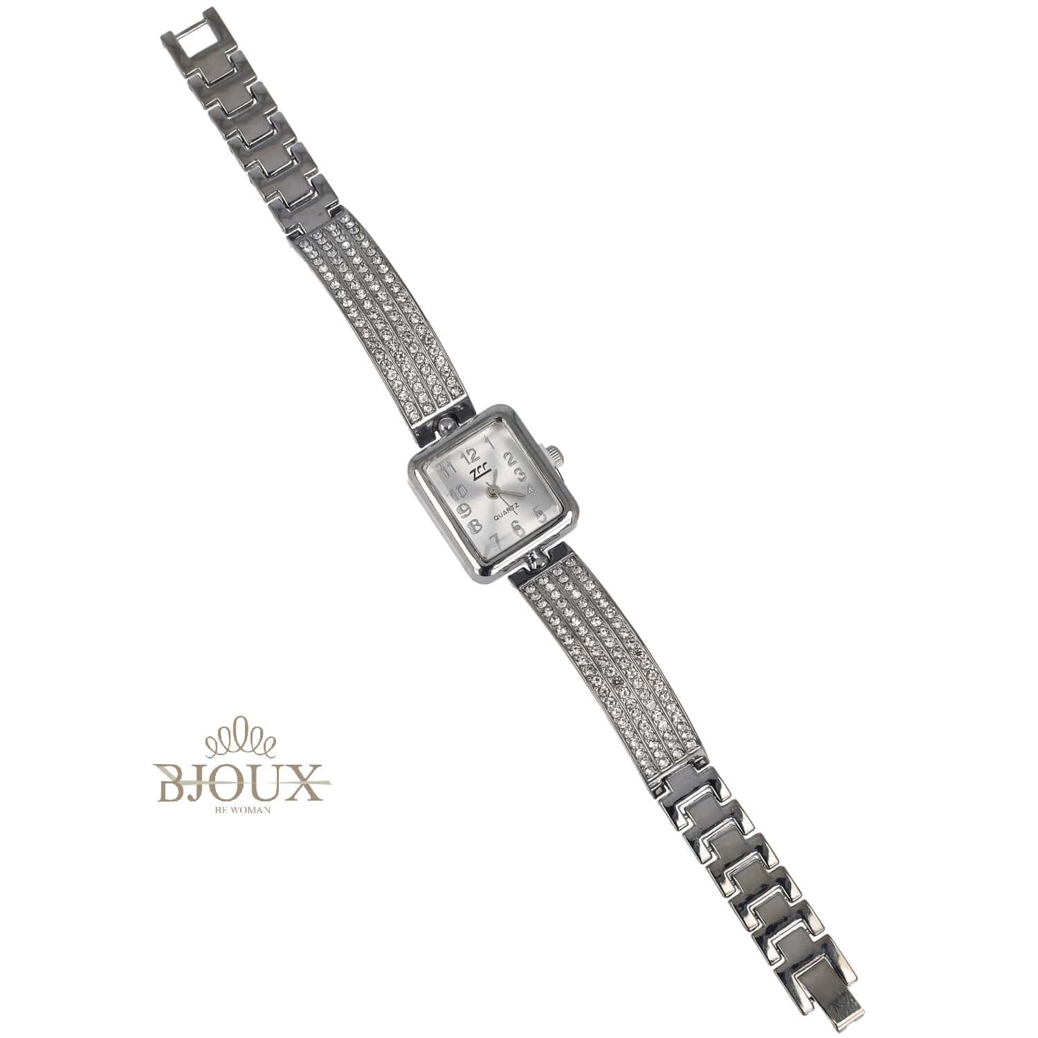 Orologio donna con cinturino in ottone dipinto decorato da pietre strass e punti luce. Cassa in acciaio rettangolare con quadrante da 2×1,8 cm