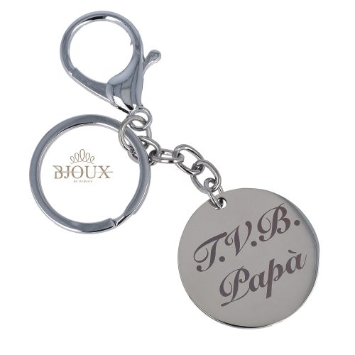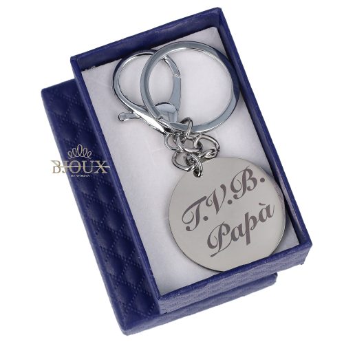Portachiavi realizzato completamente in acciaio inossidabile con gancio e rondella. Ciondolo con targa incisa diametro 3,5 cm con dedica. Astuccio regalo 5x8x3 cm