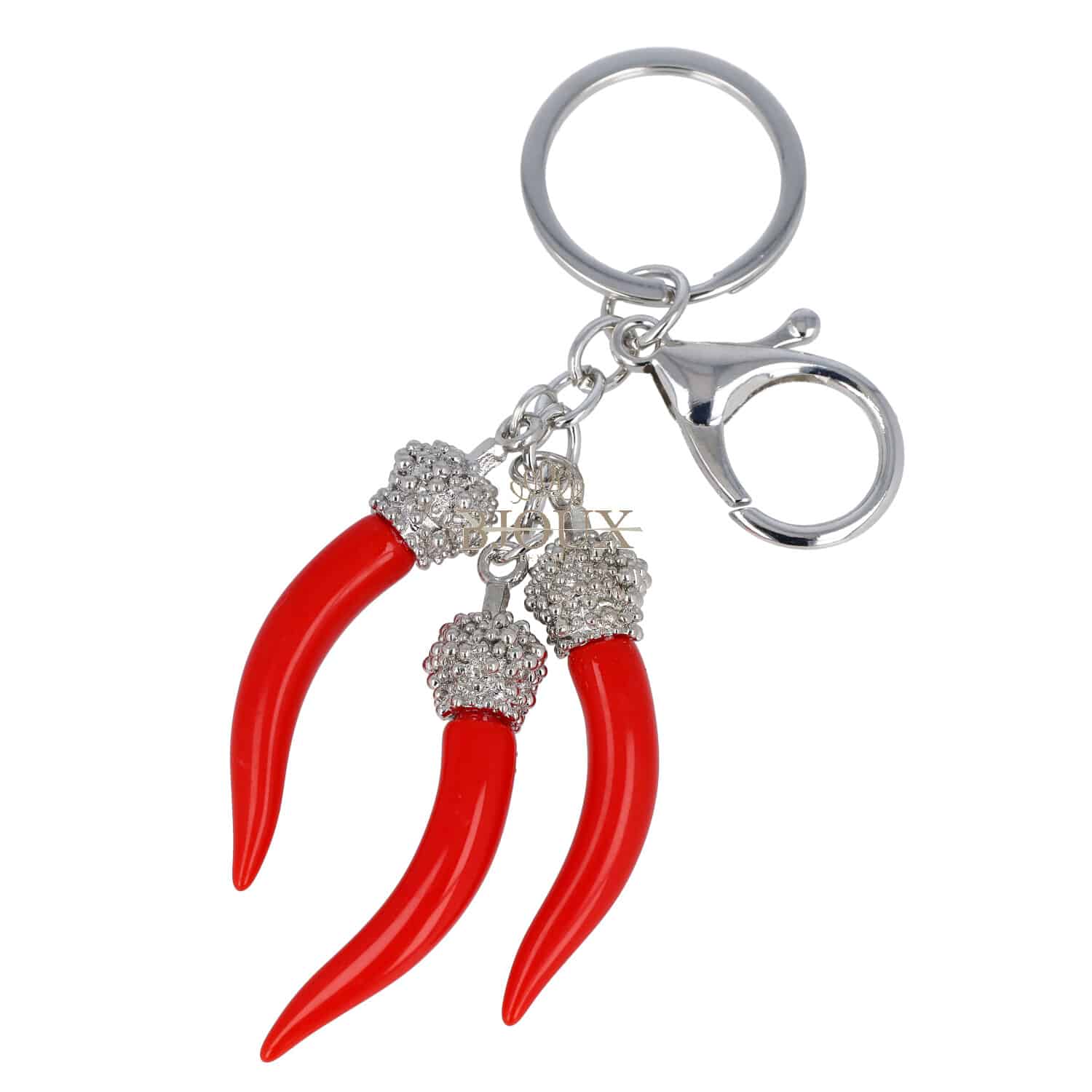 Portachiavi in materiale metallico colore argento con cornetti portafortuna in plastica colore rosso